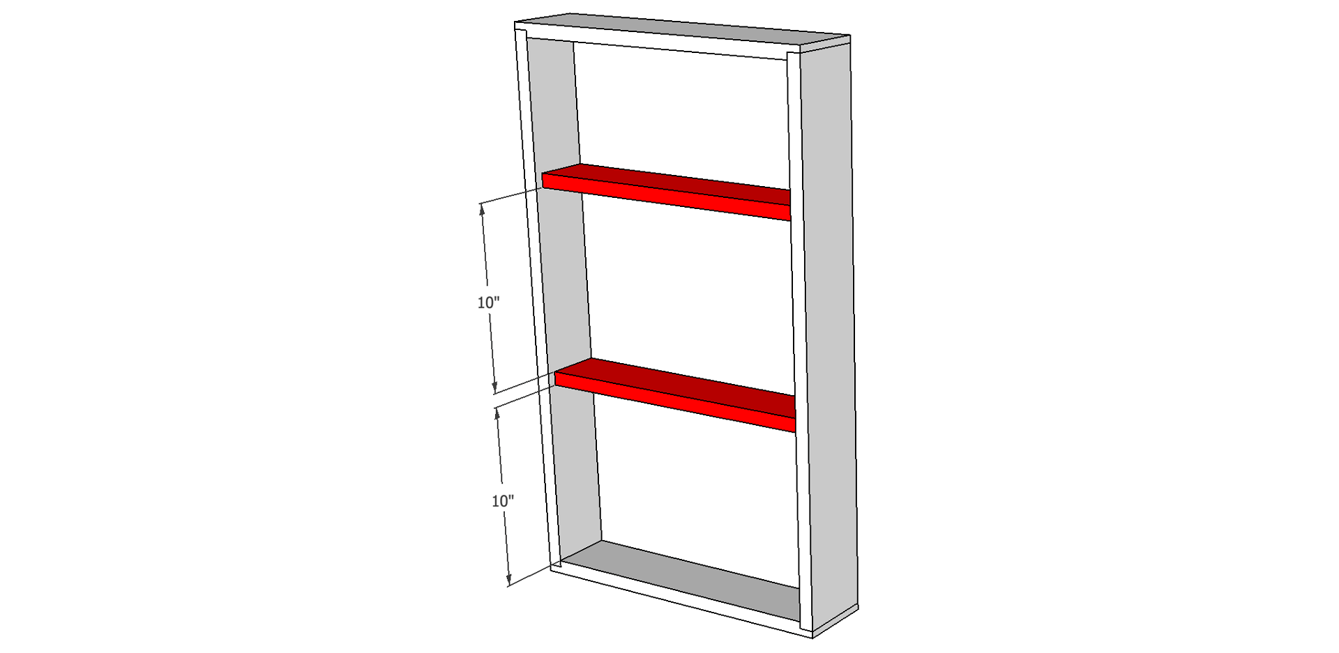 Using a couple of 10” long scrap pieces as spacers, position the shelves and attach them to the door assembly.