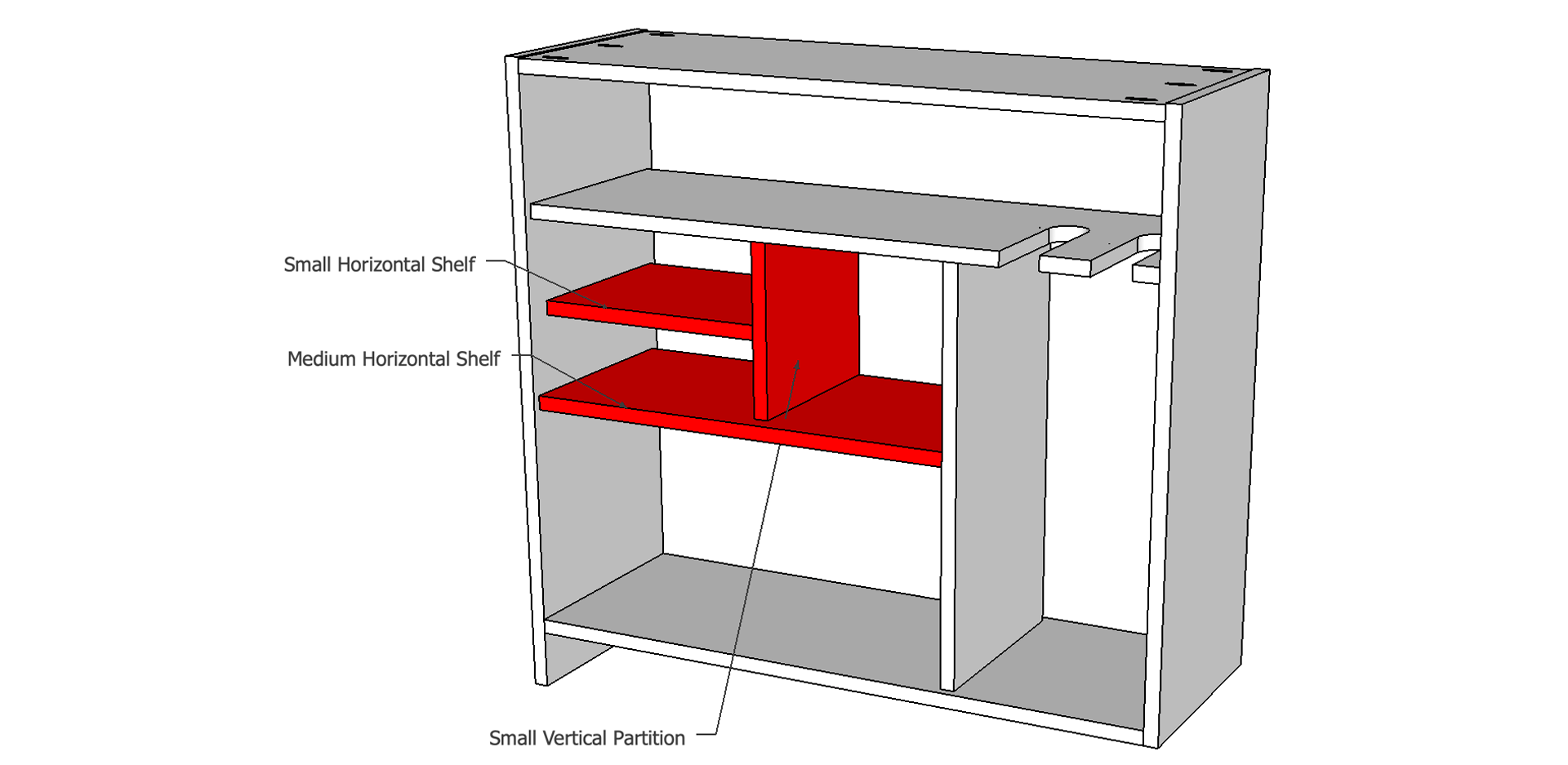Use referential measurements to determine the length of the vertical partition and cut it to size at the table saw.