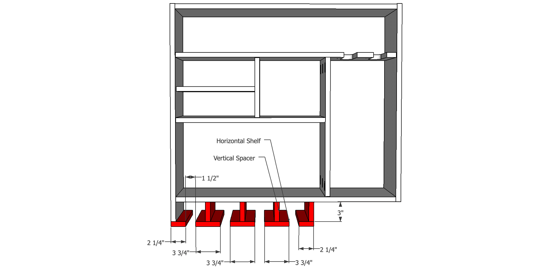 Once you have installed the horizontal shelf and the vertical partition, the rest of the partitions will be pretty straightforward. Use referential measurements and start building one partition at a time.