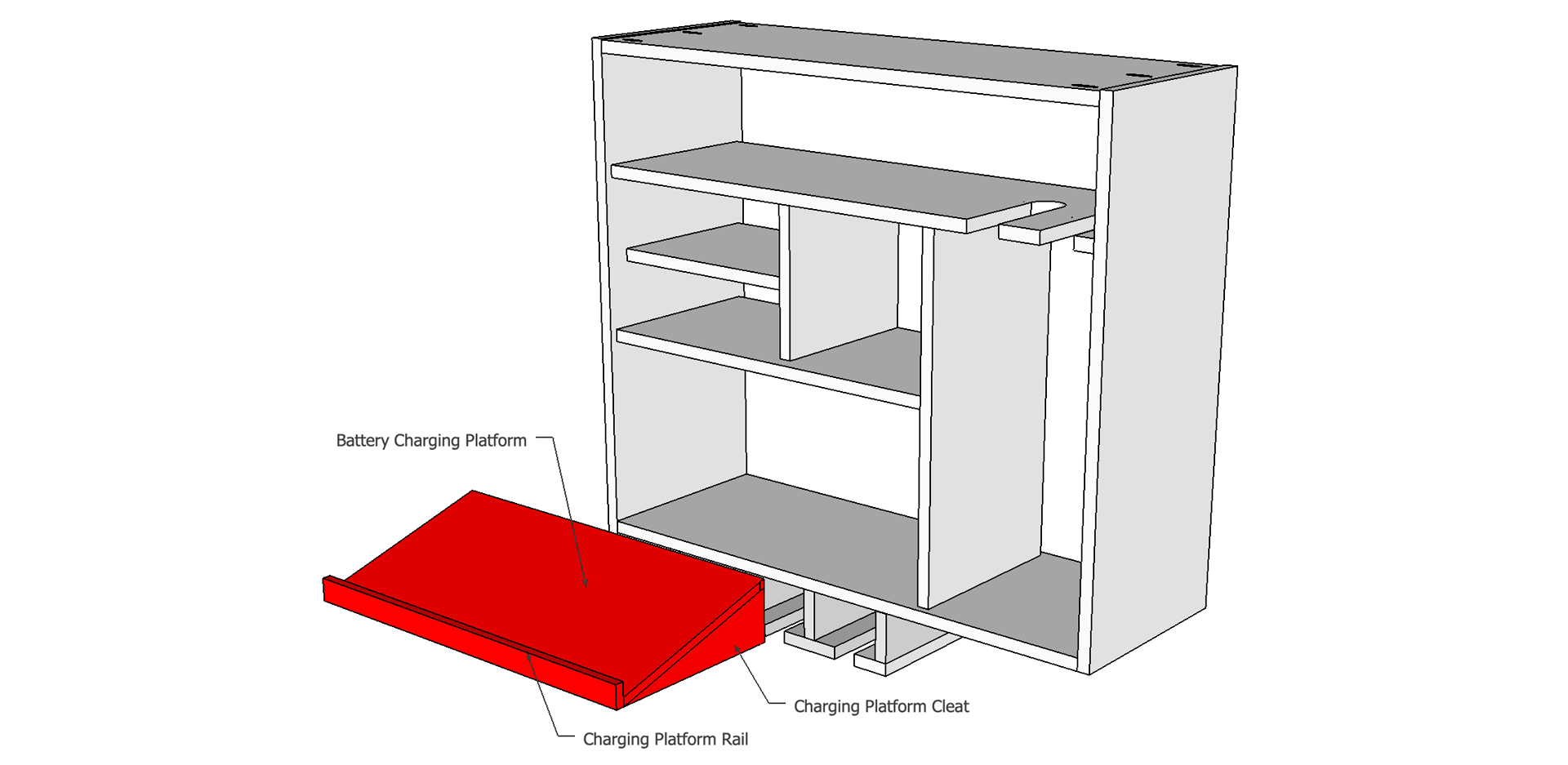 The charging platform assembly is made from ½” plywood. It is angled about 16 degrees to make it easy to remove and put in the batteries, while also adding a cool aesthetic.