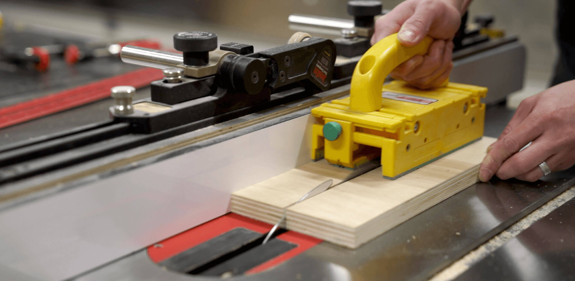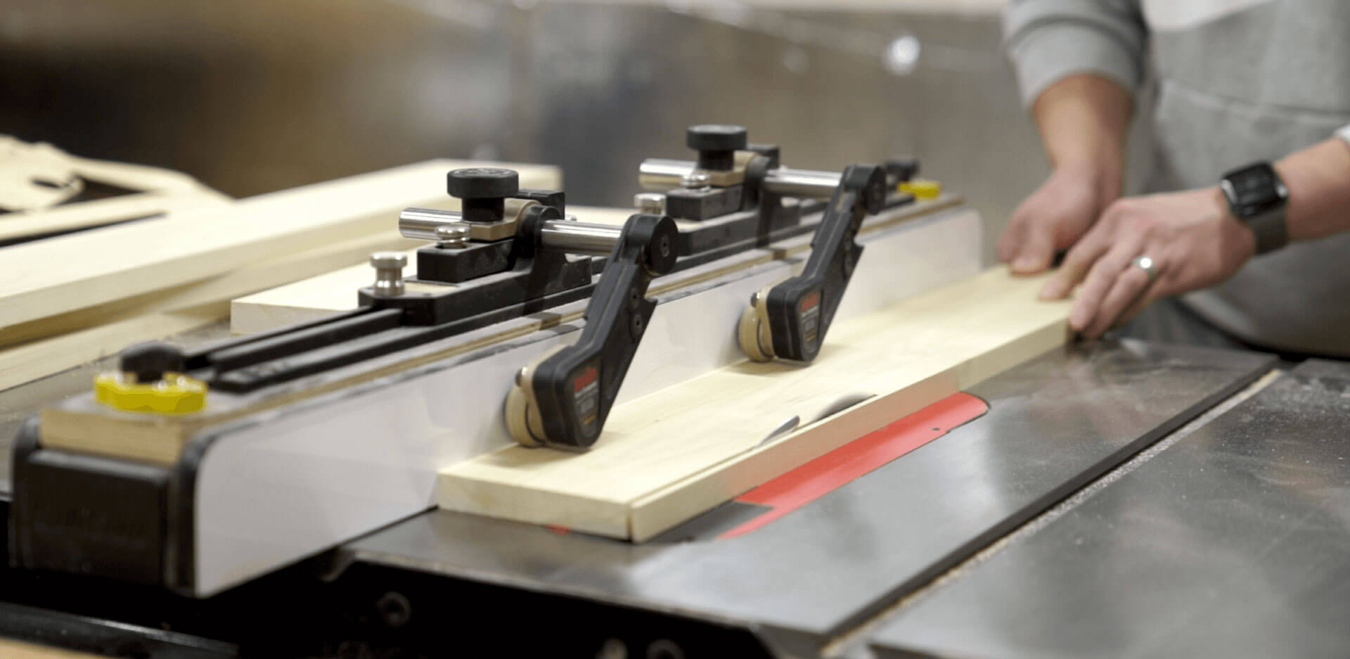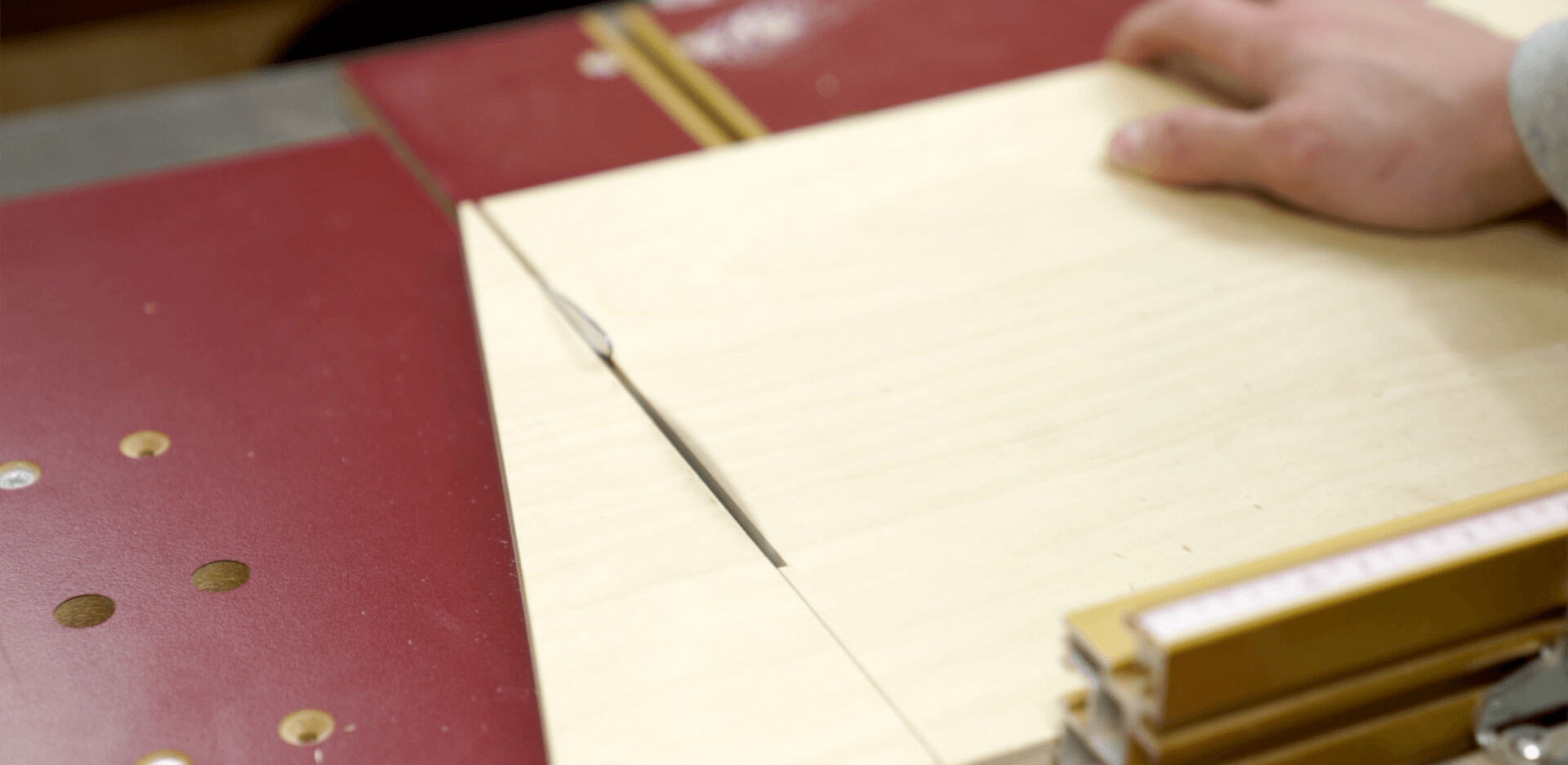 Next, setup the rip fence on your saw to cut the panels for the case down to their final widths. When making crosscuts on big pieces like this, it’s very important to keep the work piece pressed against the fence at all times to prevent any twisting in the work piece.