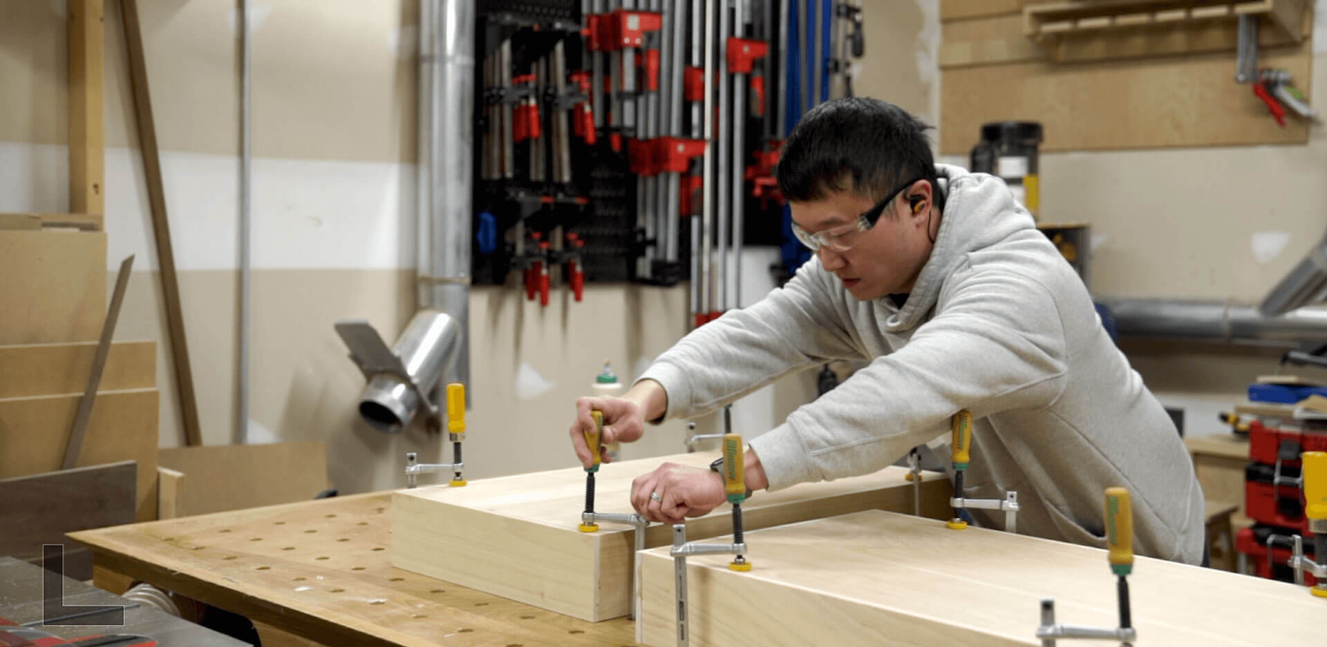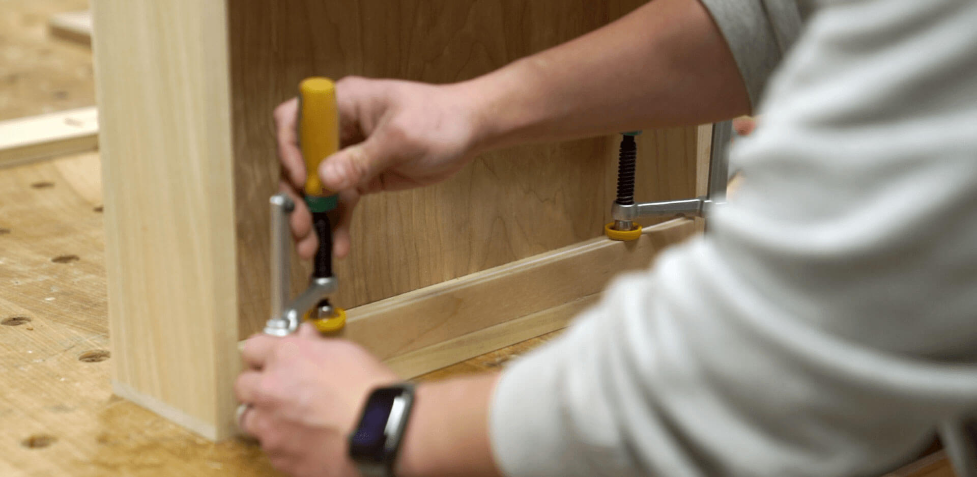 Apply glue in the rabbets of the door frames and set the door panels into rabbets. An effective method to hold the panels down in the frame is to use clamps that fit into the dog holes of your workbench. Alternatively, you can place some heavy weights on top of the door panel to hold things down.