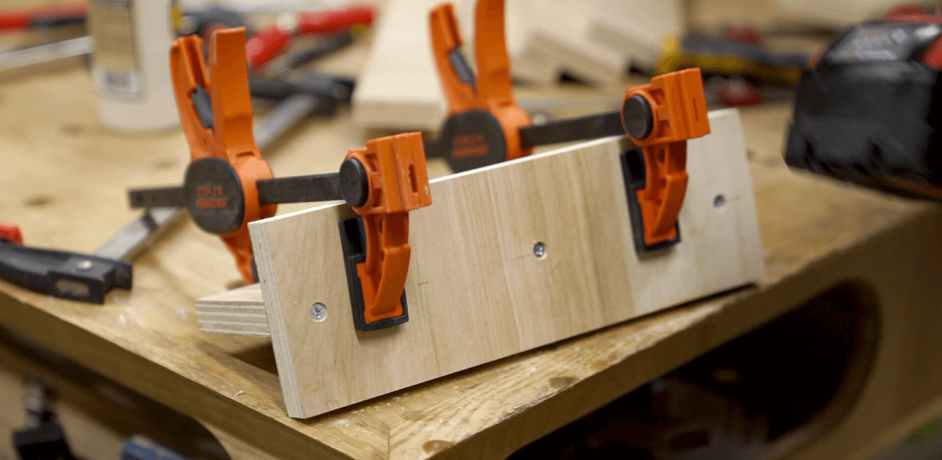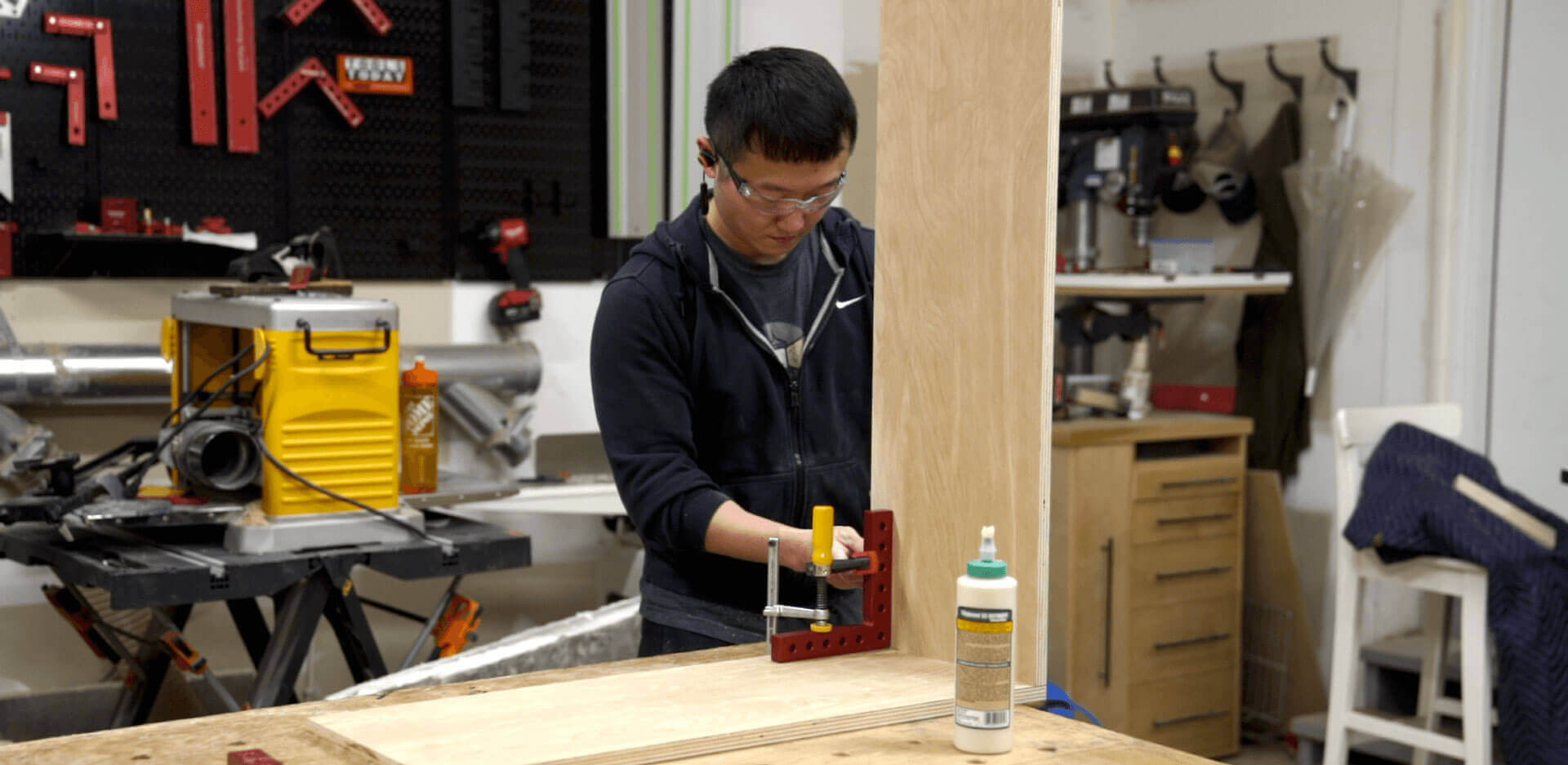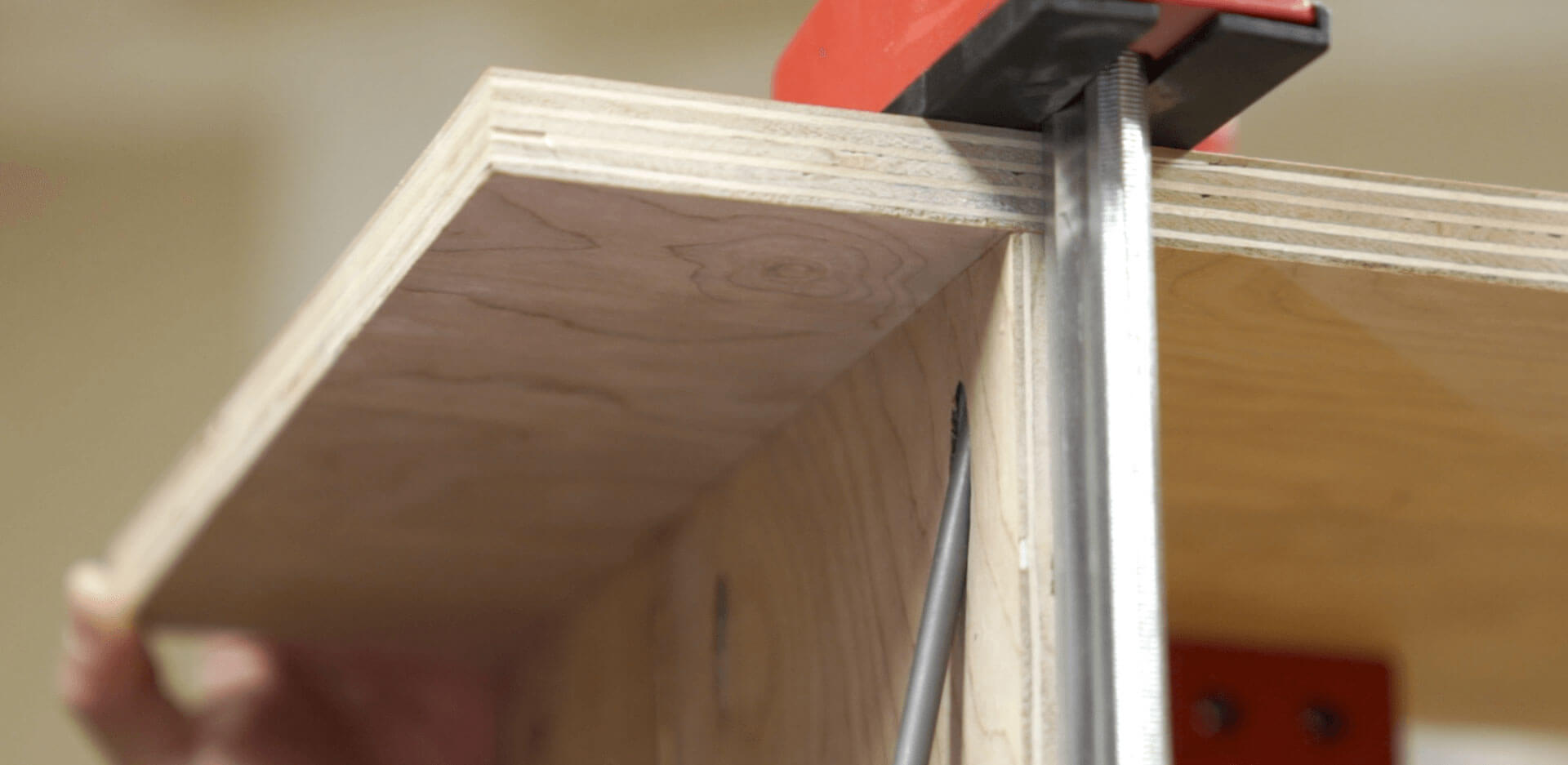 After applying glue to the edges, use right angle clamps to hold the top panel and the short side panel. This will ensure the panels will stay at 90-deg as the glue dries.