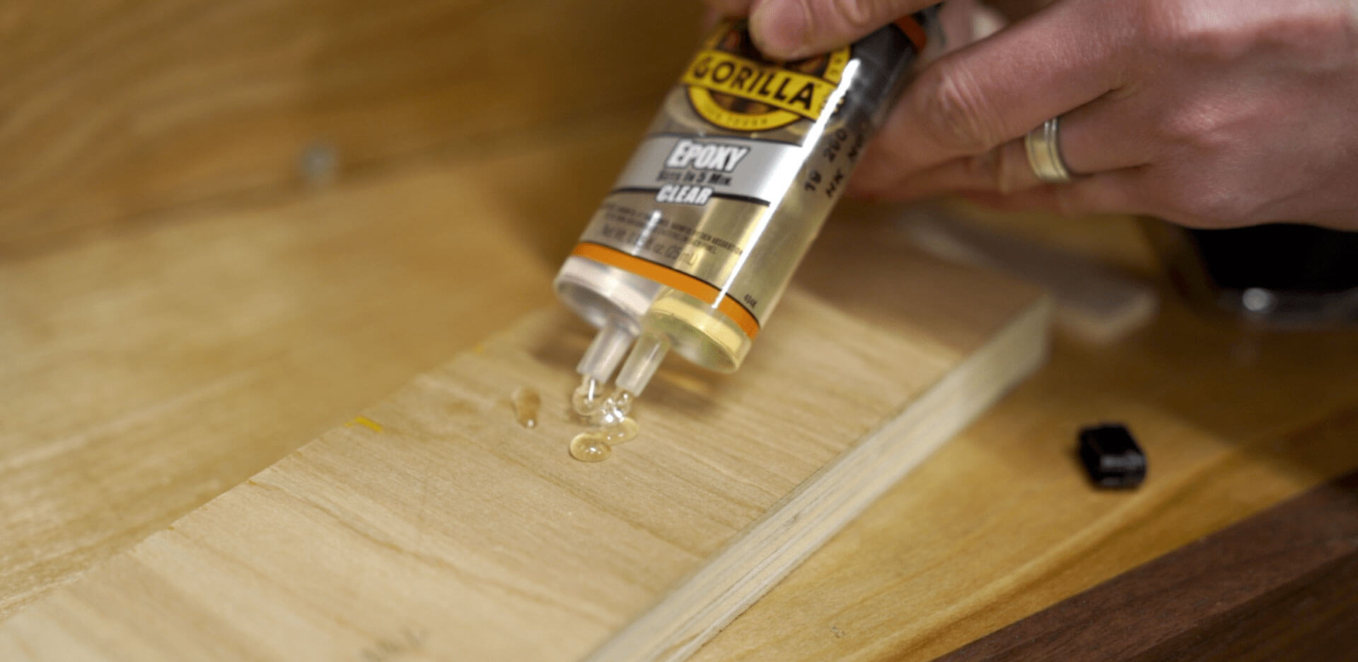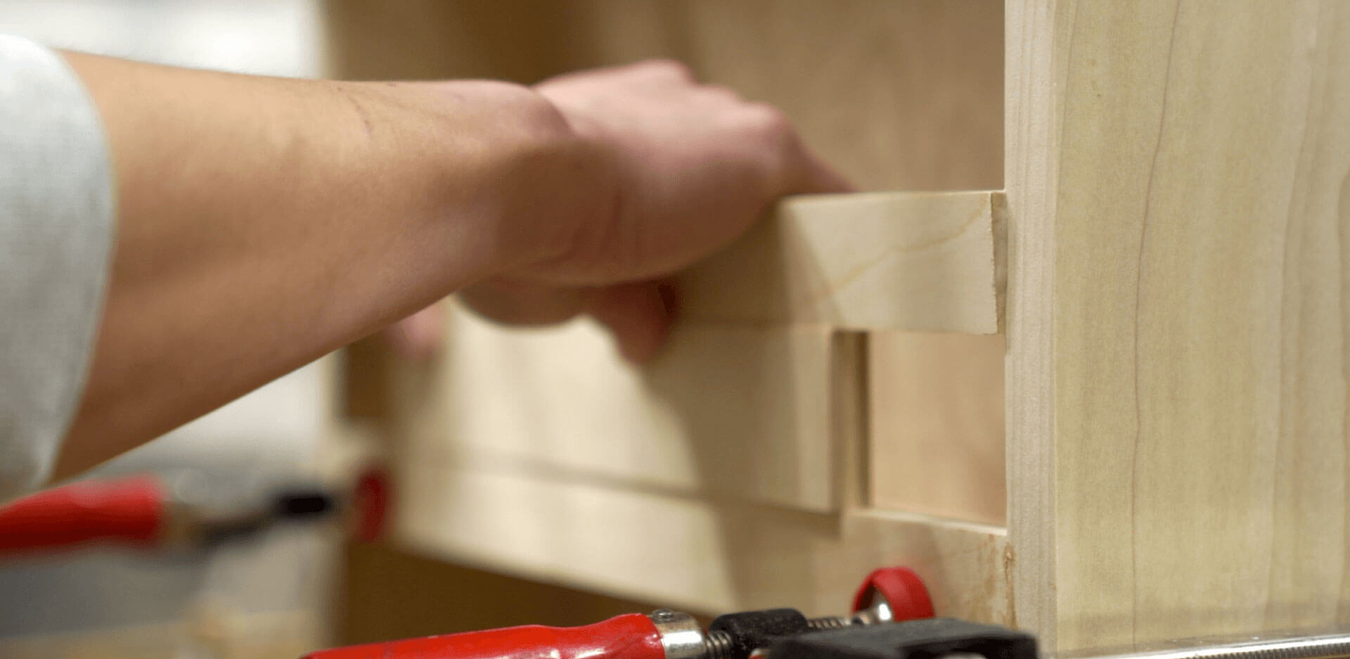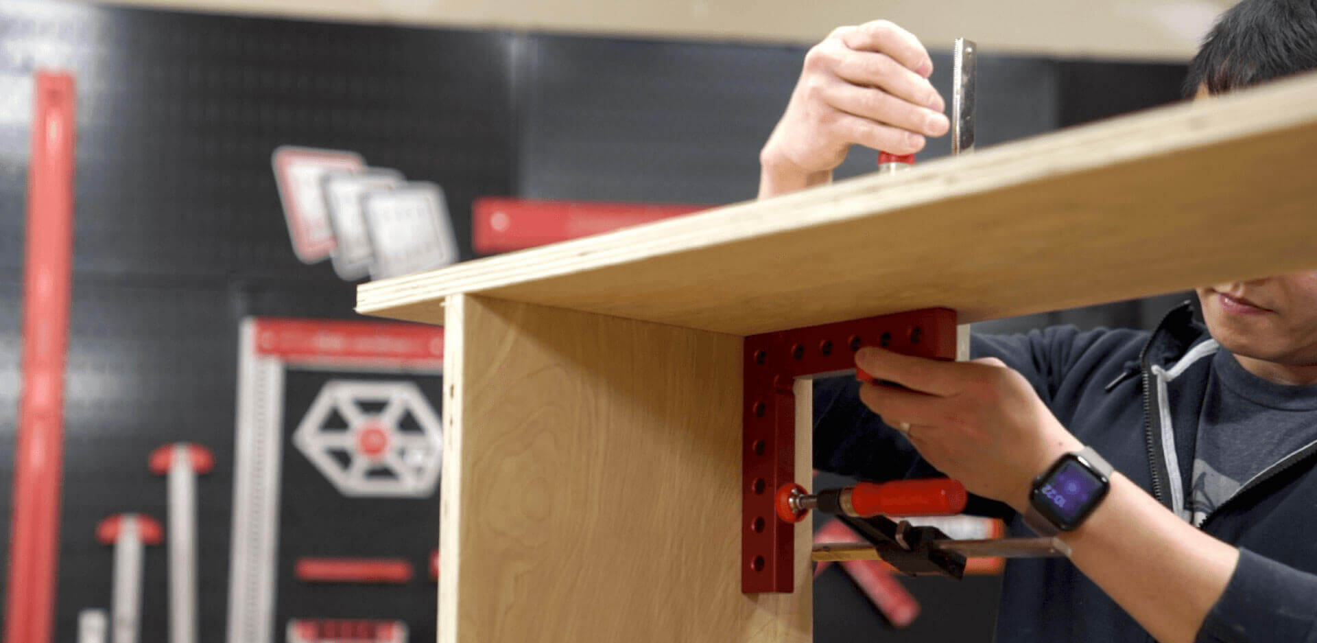 After applying glue to the edges, use right angle clamps to hold the top panel and the short side panel. This will ensure the panels will stay at 90-deg as the glue dries.