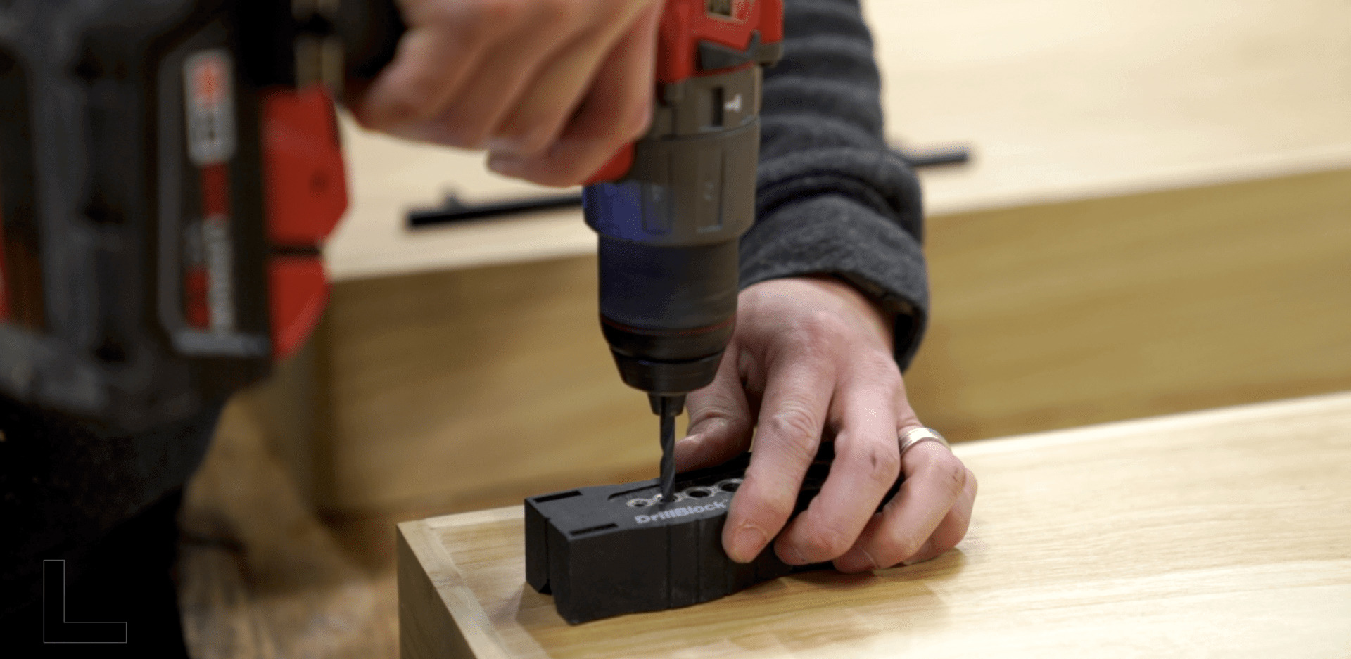 After marking the locations for where to drill the holes, use a small jig to help keep the drill perpendicular. Drill the holes.