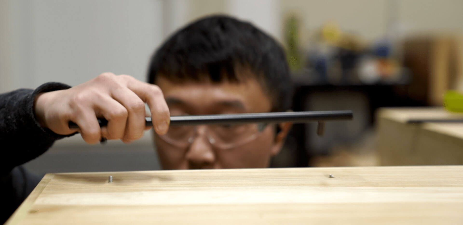 Using a couple of 10” long scrap With the door construction completed, it’s fairly easy to install the door pulls. Place the door panels side by side and roughly positioned the handles at a location that would be at eye-level once the cabinet is hung.