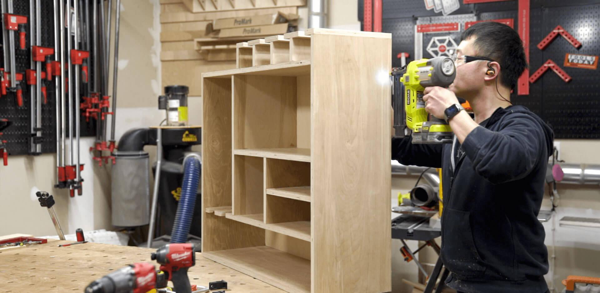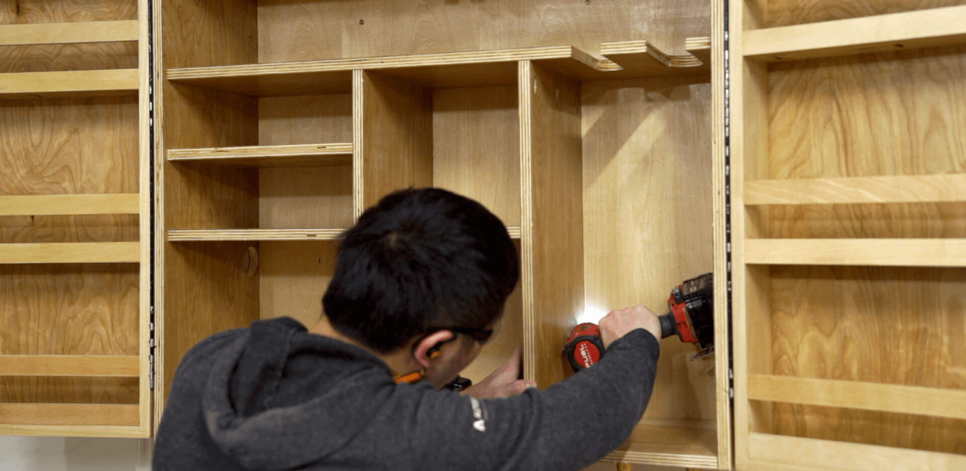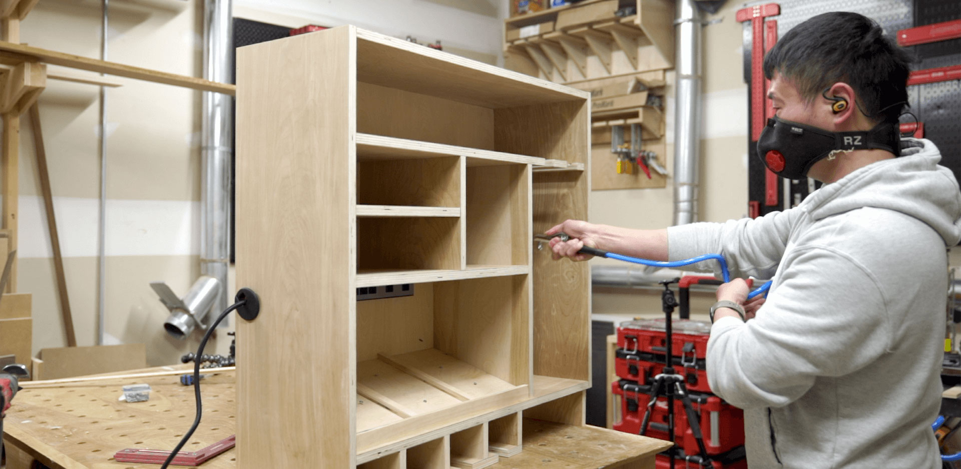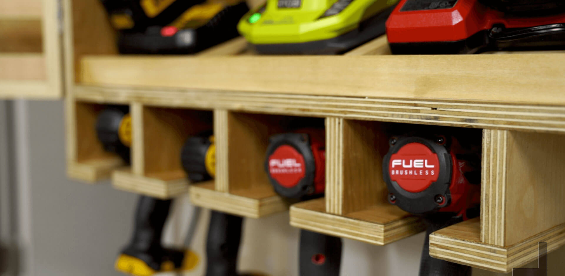 This cabinet is primarily built from one full sheet of ¾” birch plywood, including the frame, the shelves, the drill holder, and the door panel. An angled platform with dividers made from ½” birch plywood is stylish and makes it easy to insert and remove batteries. Built-in shelves behind the doors allow for added storage options for frequently-used smaller items. Add a few quick-release couplers to easily hang your pneumatic tools.