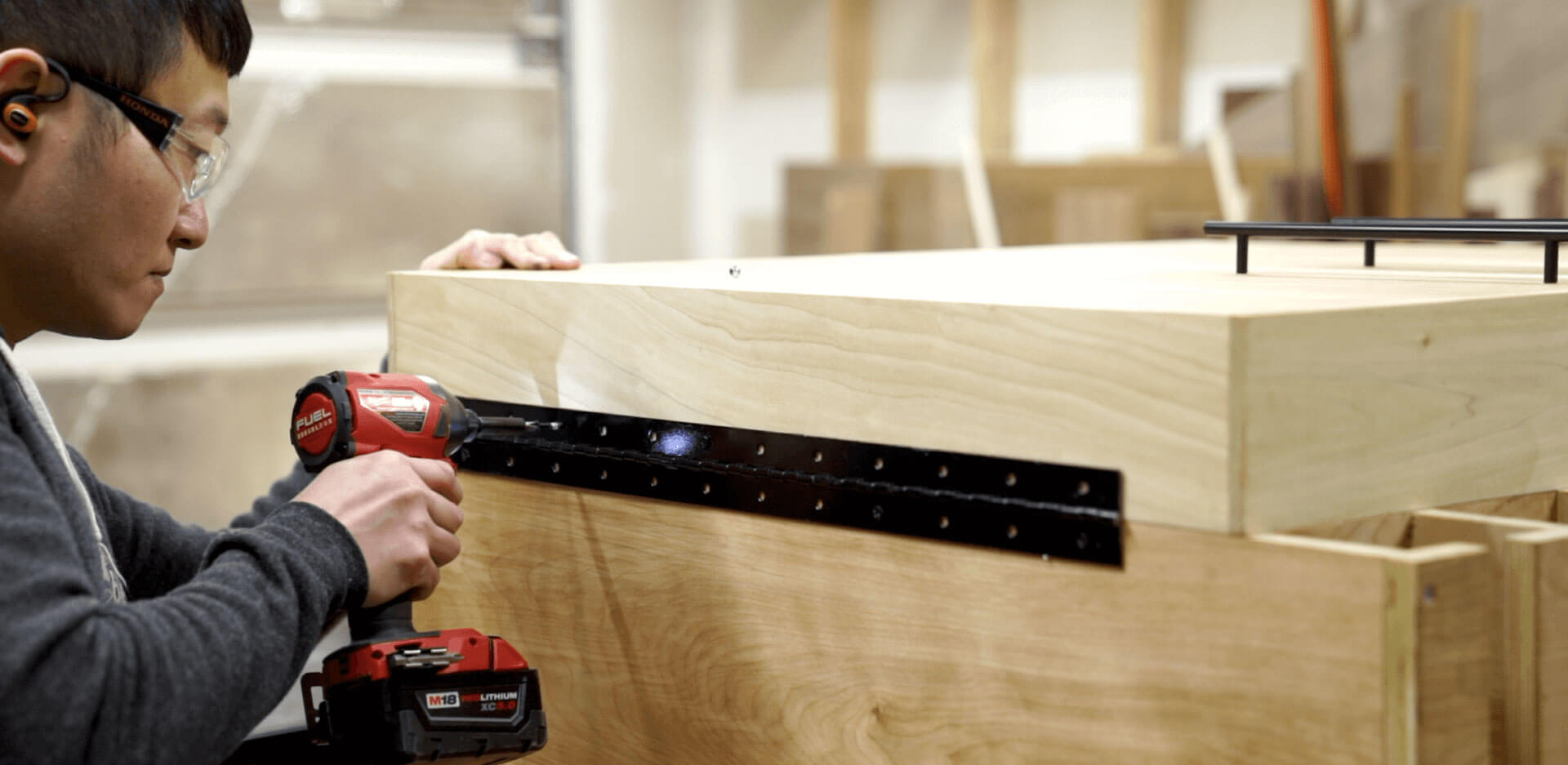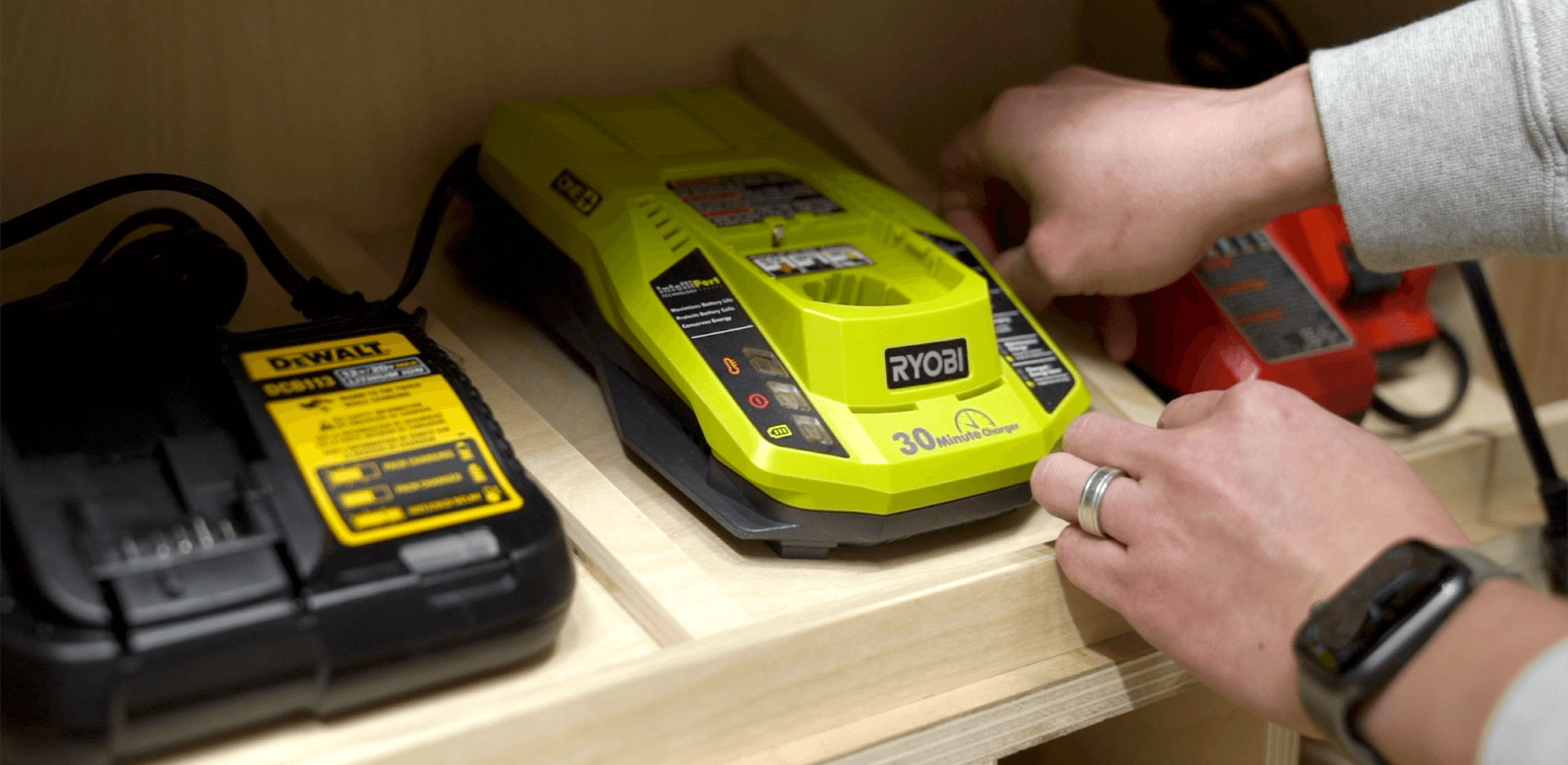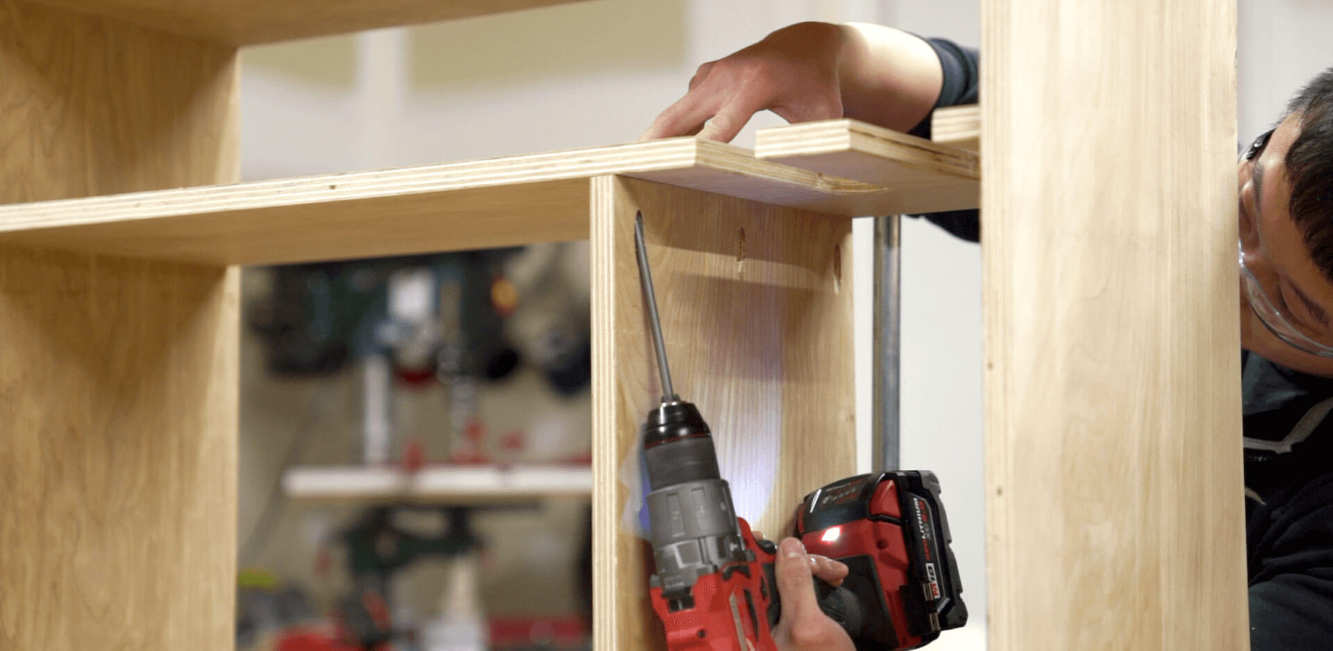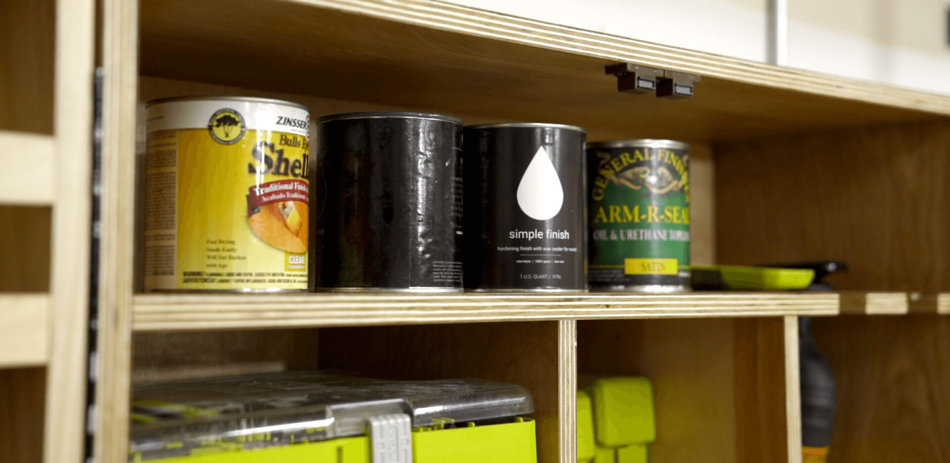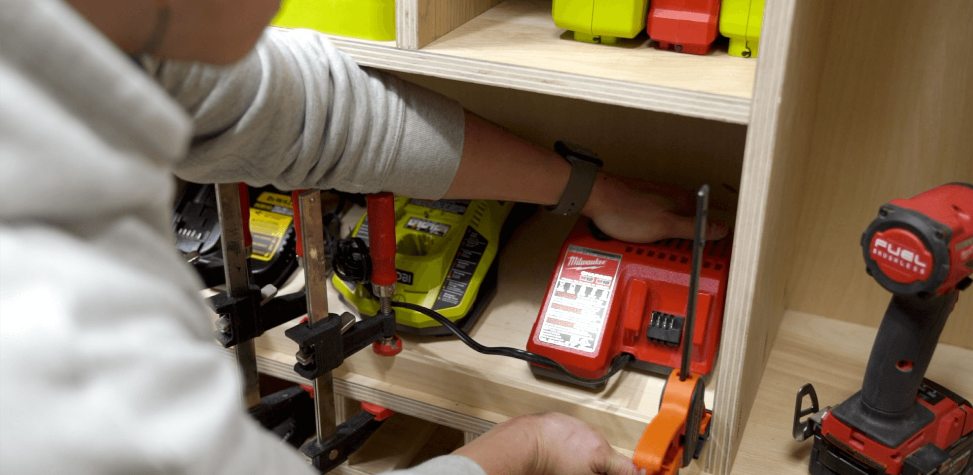 This cabinet is primarily built from one full sheet of ¾” birch plywood, including the frame, the shelves, the drill holder, and the door panel. An angled platform with dividers made from ½” birch plywood is stylish and makes it easy to insert and remove batteries. Built-in shelves behind the doors allow for added storage options for frequently-used smaller items. Add a few quick-release couplers to easily hang your pneumatic tools.