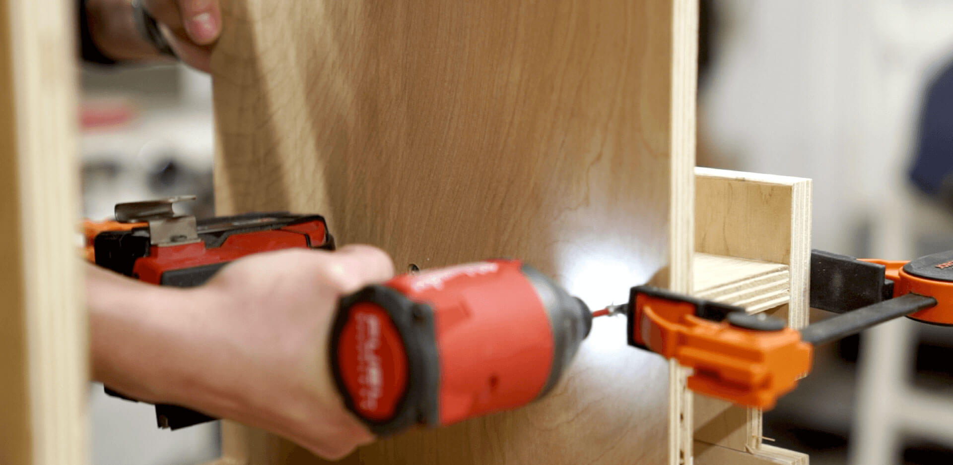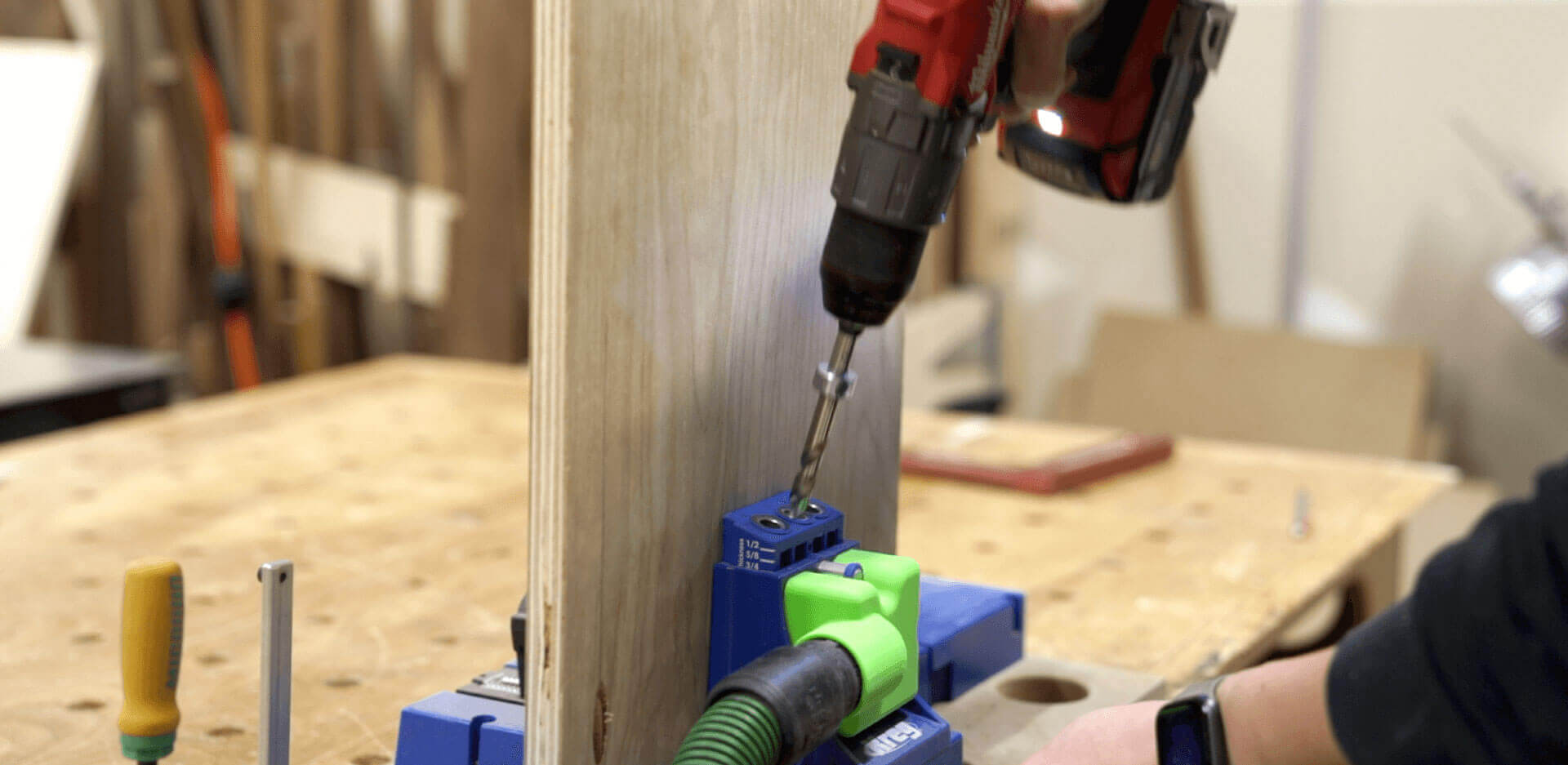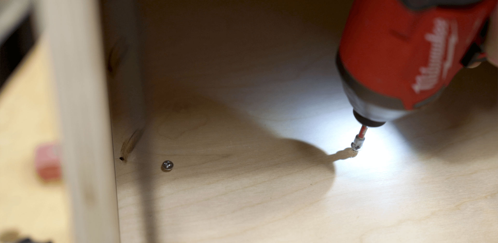 Determine the best position of your tool so that it will not protrude past the front side of the cabinet. Draw a line to represent the centerline of the hole locations. Place a piece of blue tape on the end of your drill bit to indicate where to stop so you don’t blow through the top surface of the bottom panel.