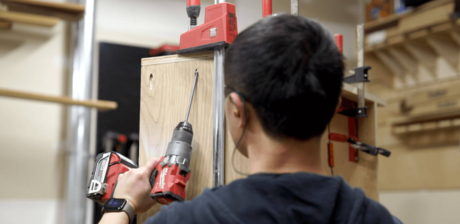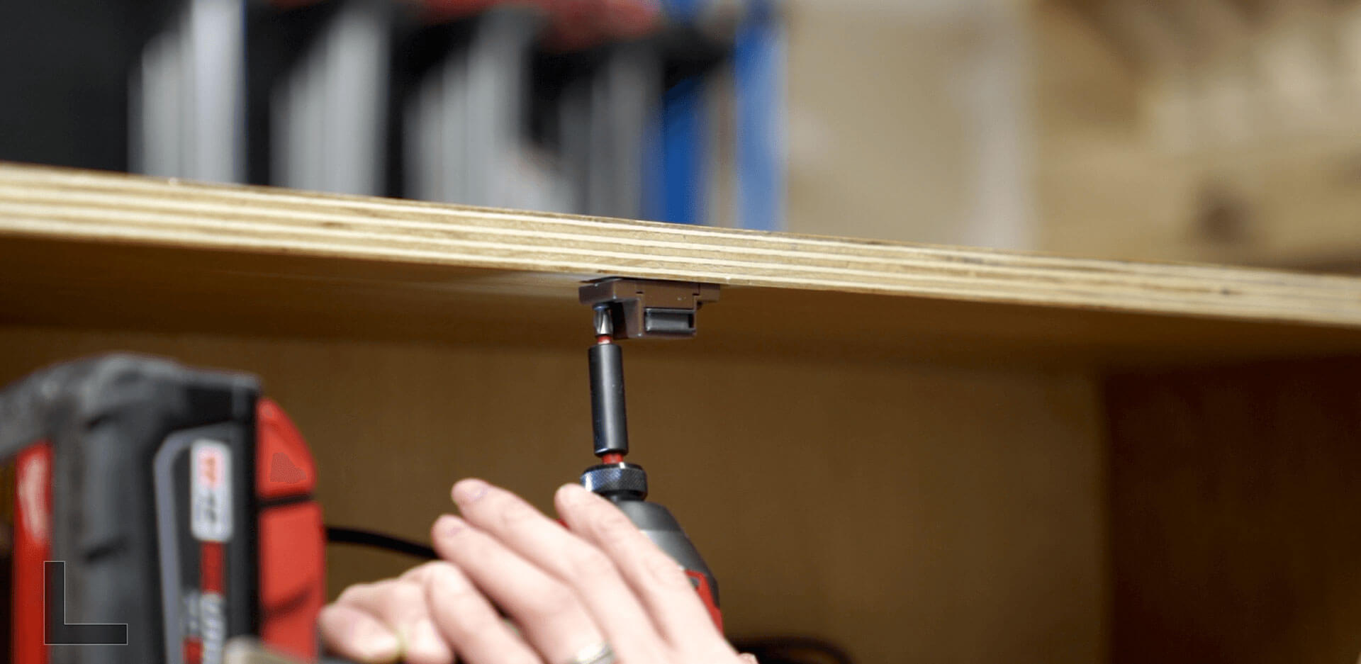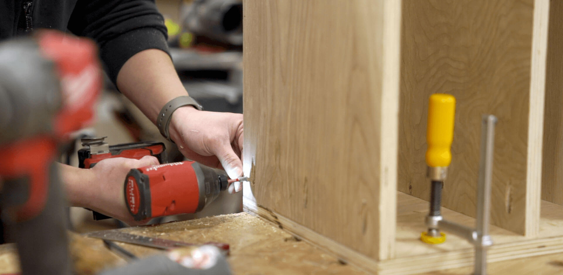 Determine the best position of your tool so that it will not protrude past the front side of the cabinet. Draw a line to represent the centerline of the hole locations. Place a piece of blue tape on the end of your drill bit to indicate where to stop so you don’t blow through the top surface of the bottom panel.