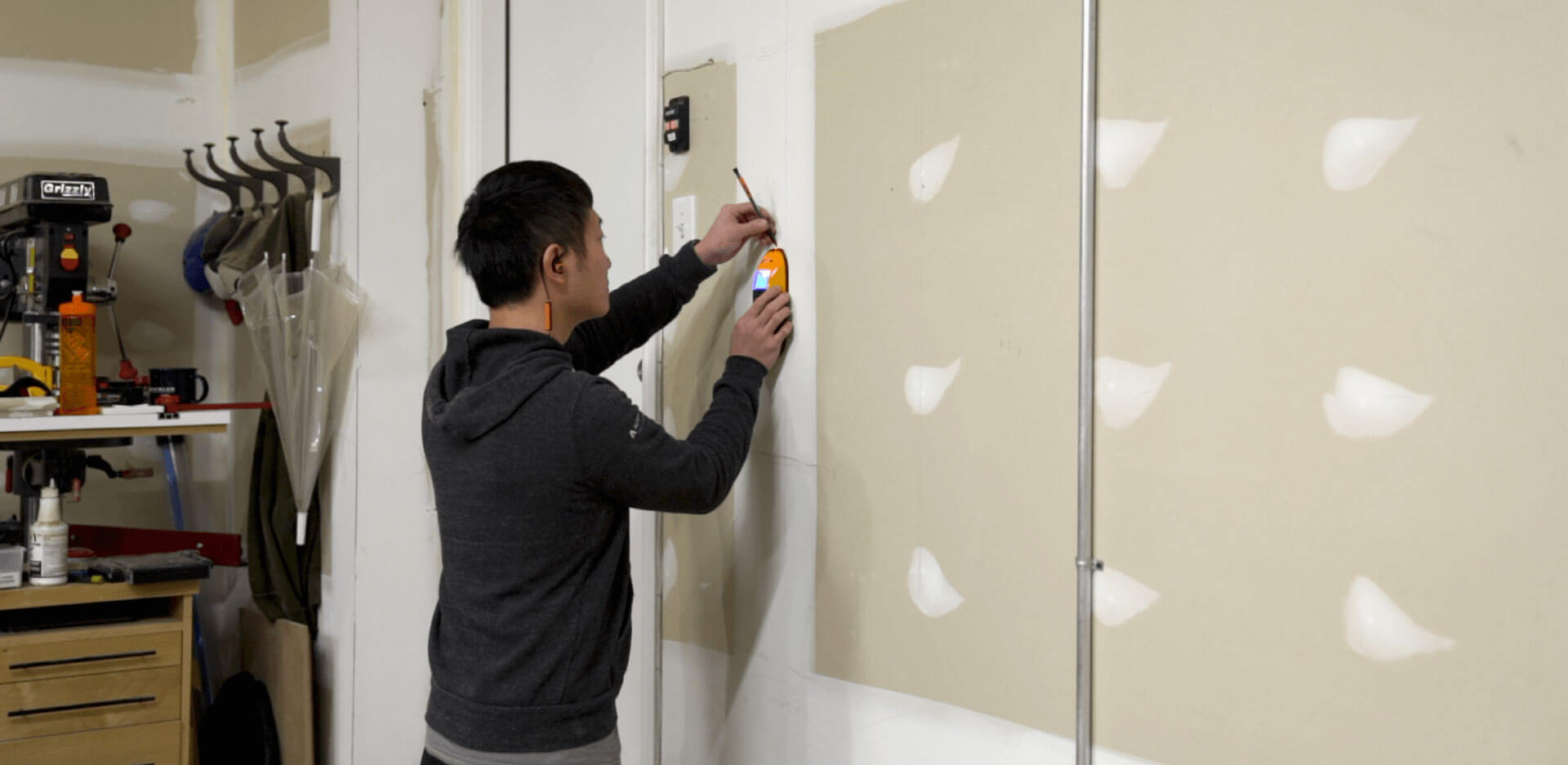 Once the two studs are located, use a level to strike a line that extends past the cabinet on top and bottom so it’ll be easy to find where to drill once the cabinet is in place.