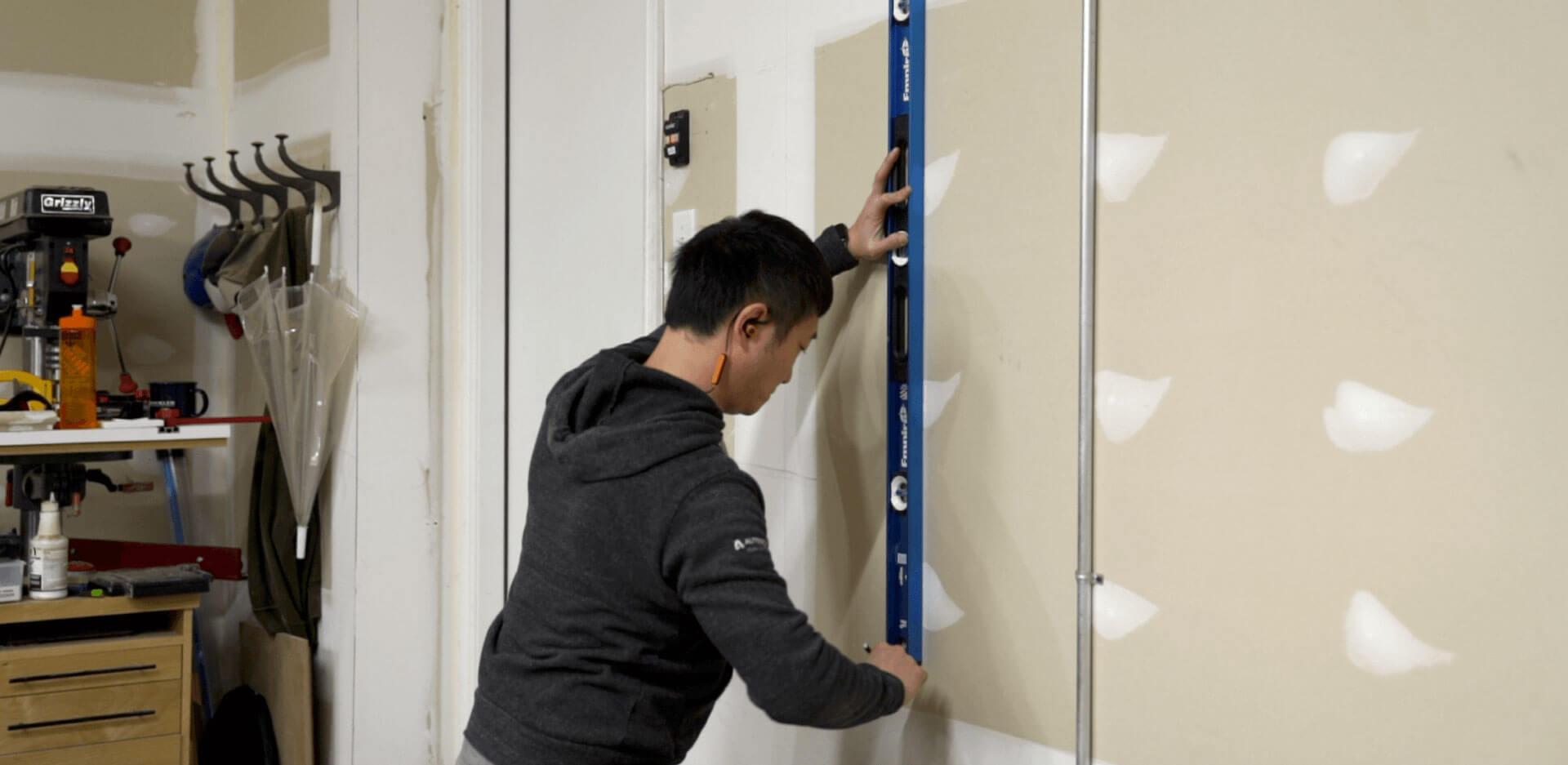 Place a level on top of the cabinet and shim underneath the cabinet until it’s level. Once everything is ready, use some 2-1/2” screws to attach the cabinet to the studs.