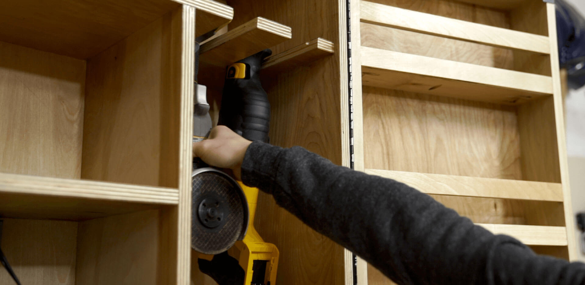 With the horizontal shelf cut to size, begin to layout which tools you want to hang. For me, it’ll be an angle grinder and a reciprocating saw. If your tools are different than mine, make sure to lay the tools out and measure before cutting based on the numbers in the plans.