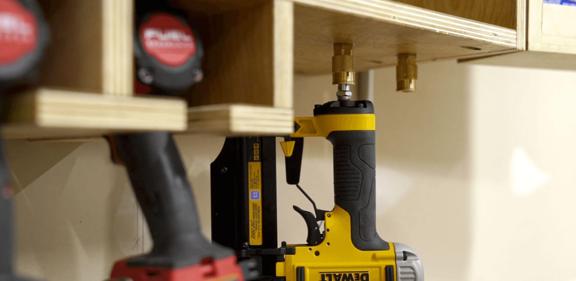 If you have some pneumatic tools that you want to store, I think the best way to do this is using some of these store-bought quick releases with a 1/2” male end.