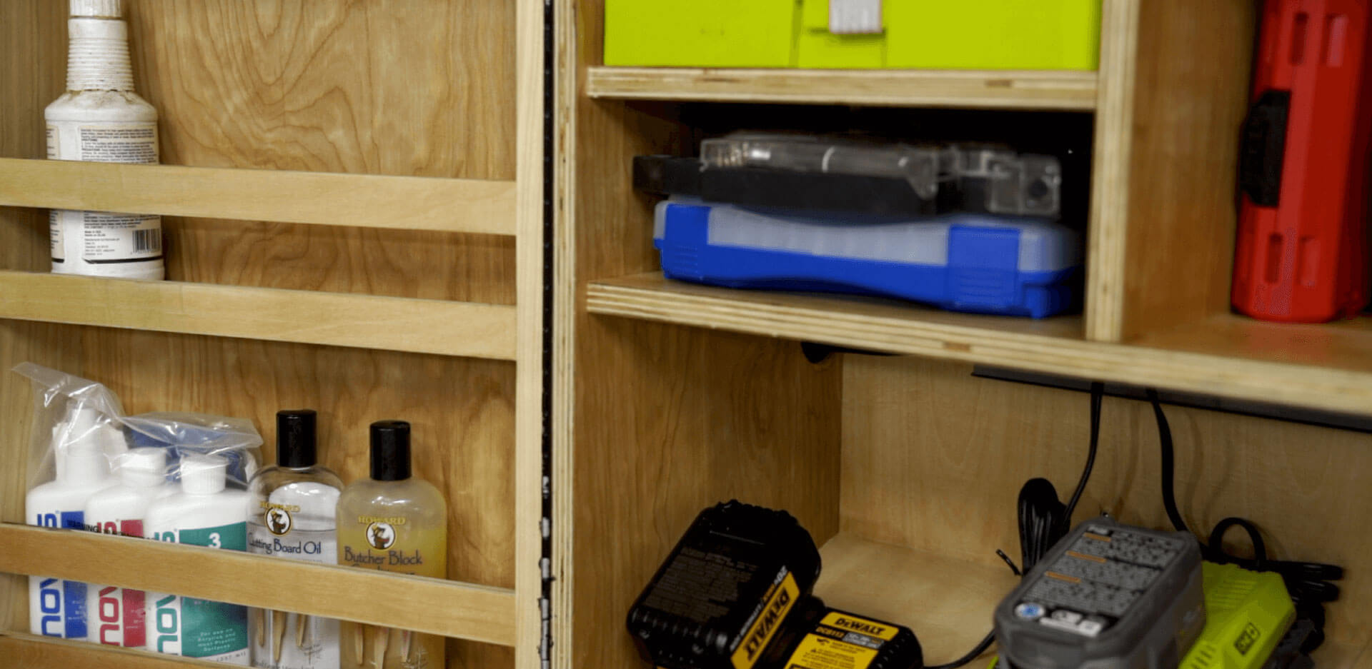 This sturdy wall cabinet delivers lots of storage options, including charging and storage for common handheld power tools. Use the built-in door racks and custom shelving to easily customize the plans to fit your storage needs.