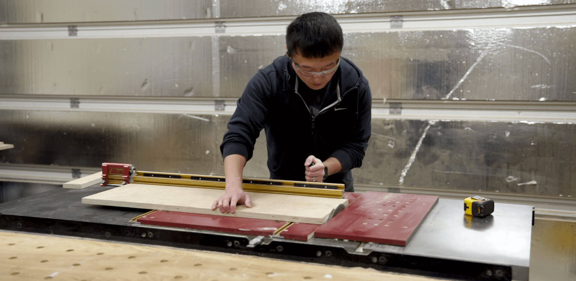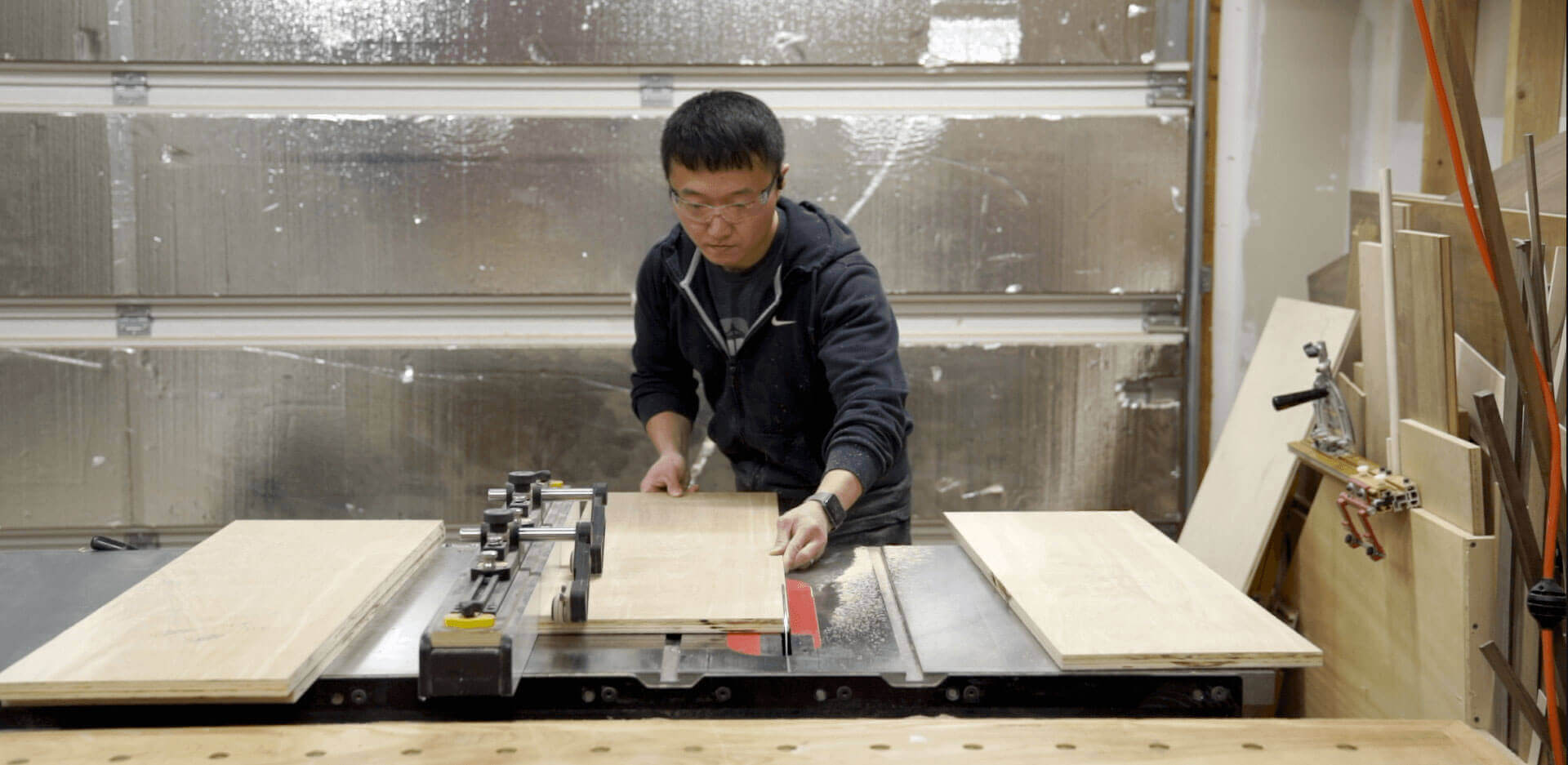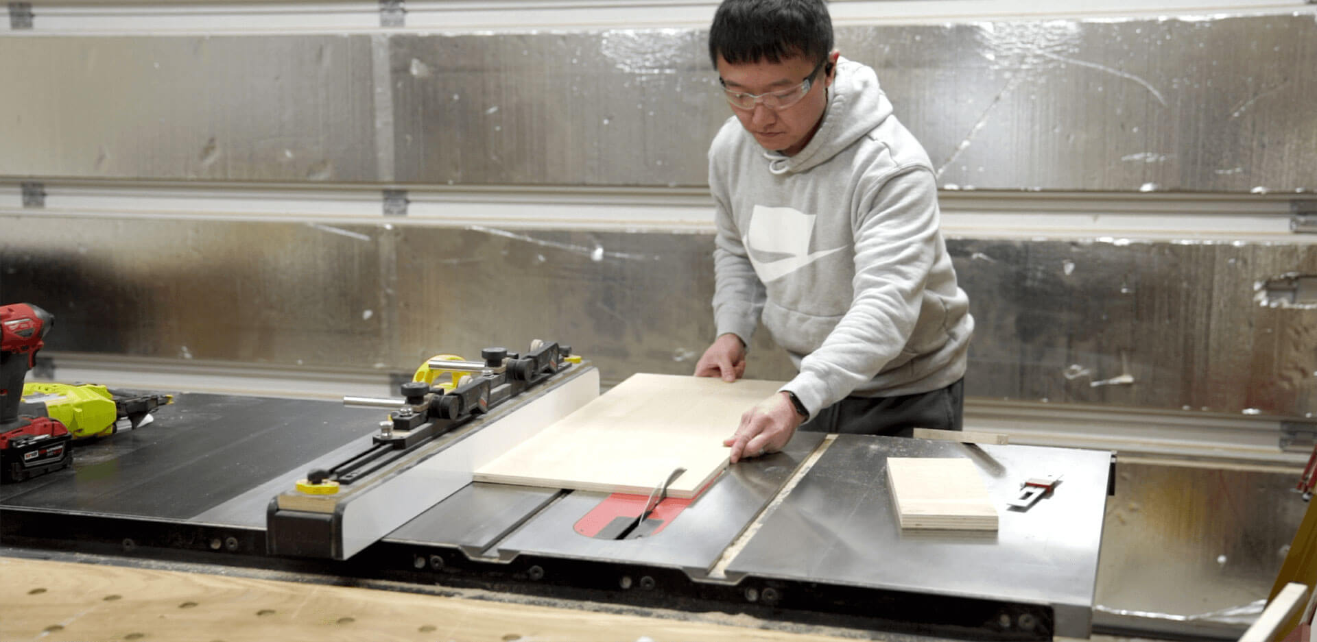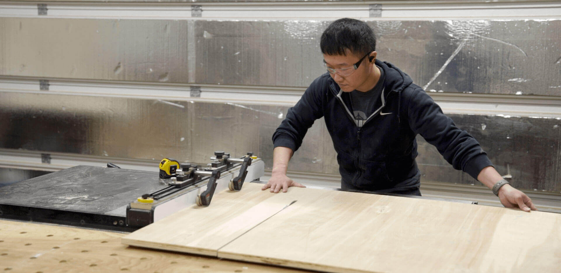 First, break down all of the cabinet pieces to smaller, more manageable sizes. There are many ways to break down a full sheet of 4’x8’ plywood. One option is simply to ask your lumber dealer to crosscut the panel down to 1×33-1/2” piece and 1x 33” piece.