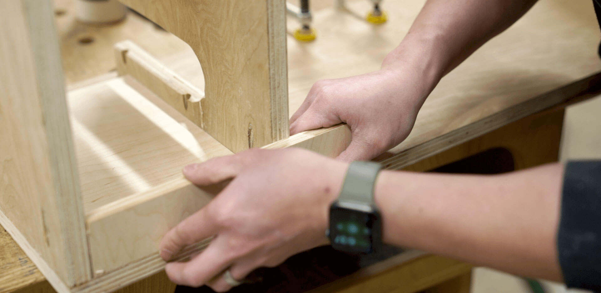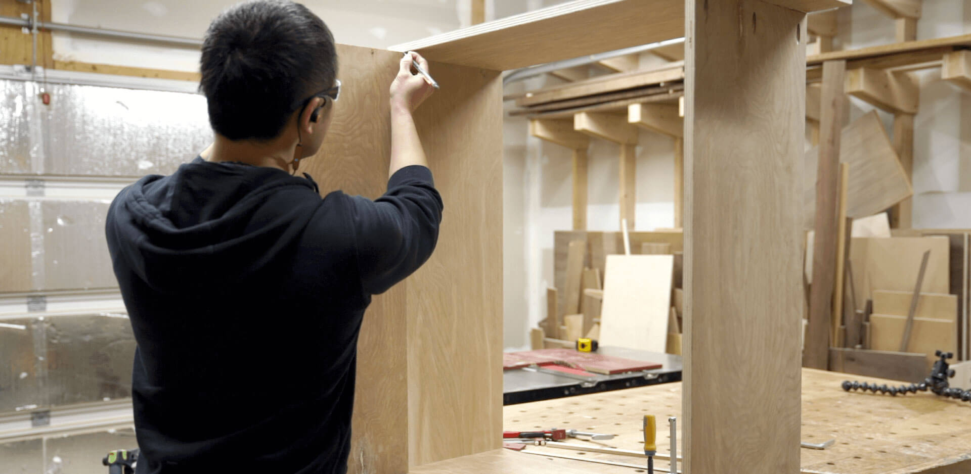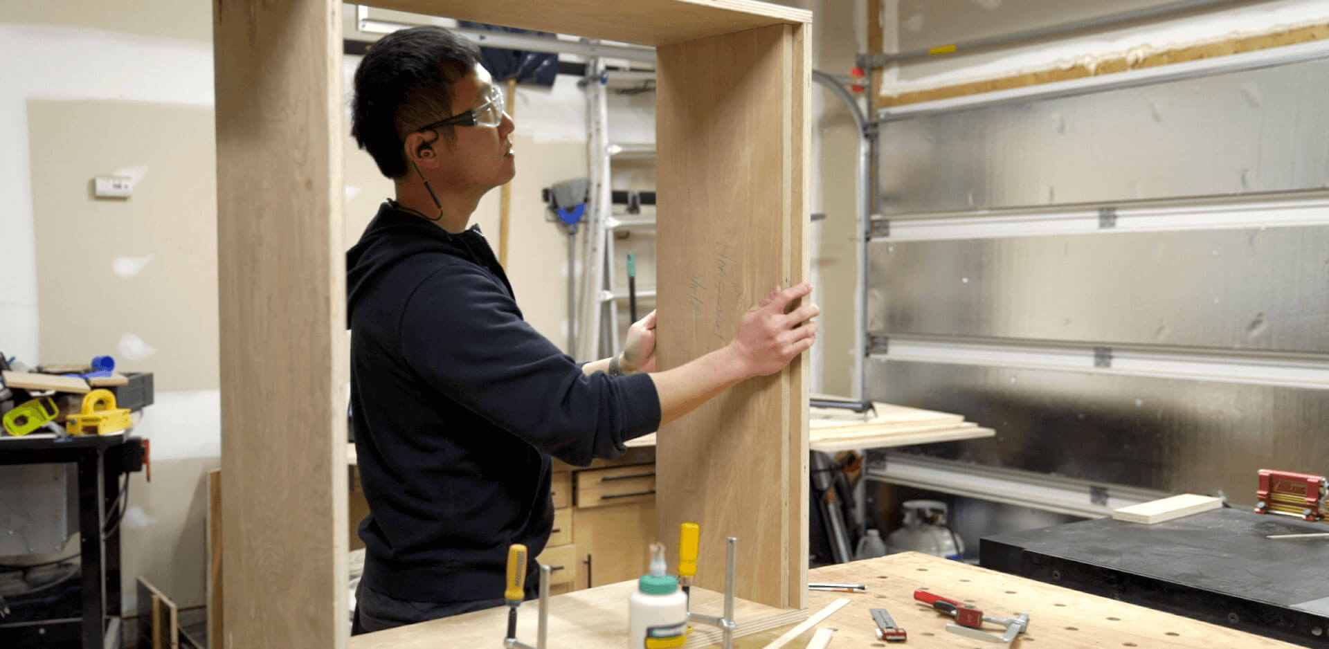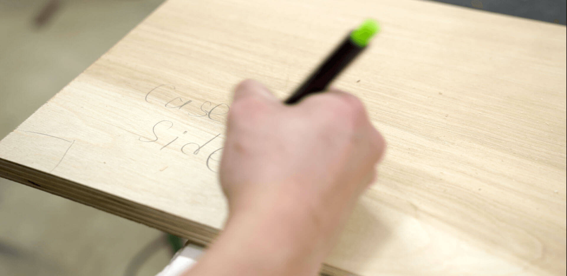 As I previously mentioned, I cut all pieces about 1/8” longer than necessary. This allows me to hold the workpiece up to my assembled case, strike a line, and finalize the length of the piece before gluing it in. In this image, you see me taking the referential measurement along the side. This is because plywood isn’t always flat, so the case might have a slight bow in the center. By referencing against the side, you are more likely to get the perfect length that will actually push or pull the case back straight.