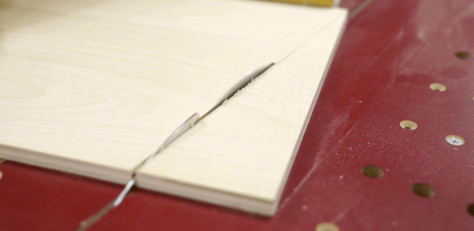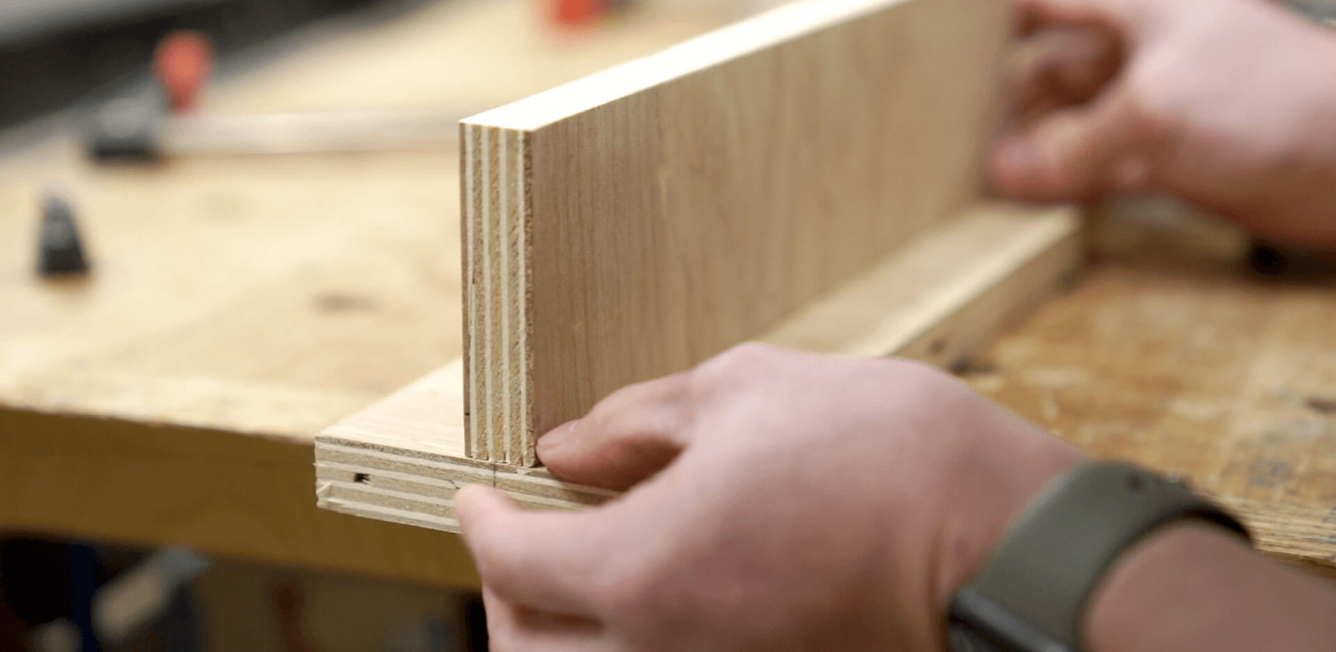 Mark the center of the horizontal shelf, then apply glue on the vertical piece and attach the two pieces. Tip: use the center ply on the vertical piece to center the pieces.