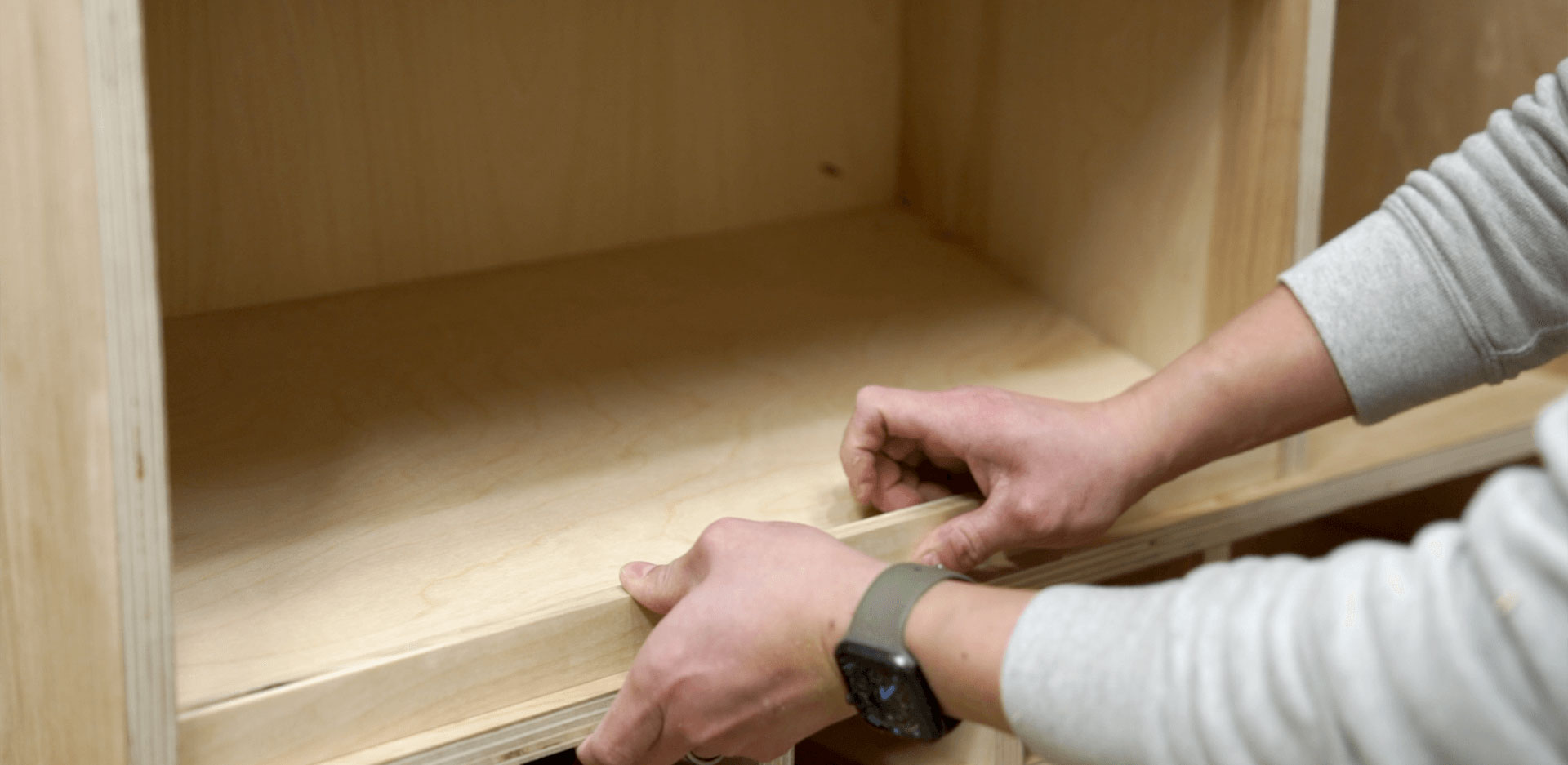 With the case laying on its side, use two scrap pieces of plywood as spacers to help position the shelf.