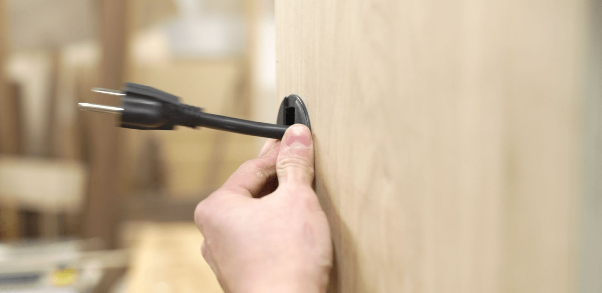 Drill a 2” diameter hole on the side of the cabinet for the power extension cord. To keep things nice and neat, add a 2” desk grommet.