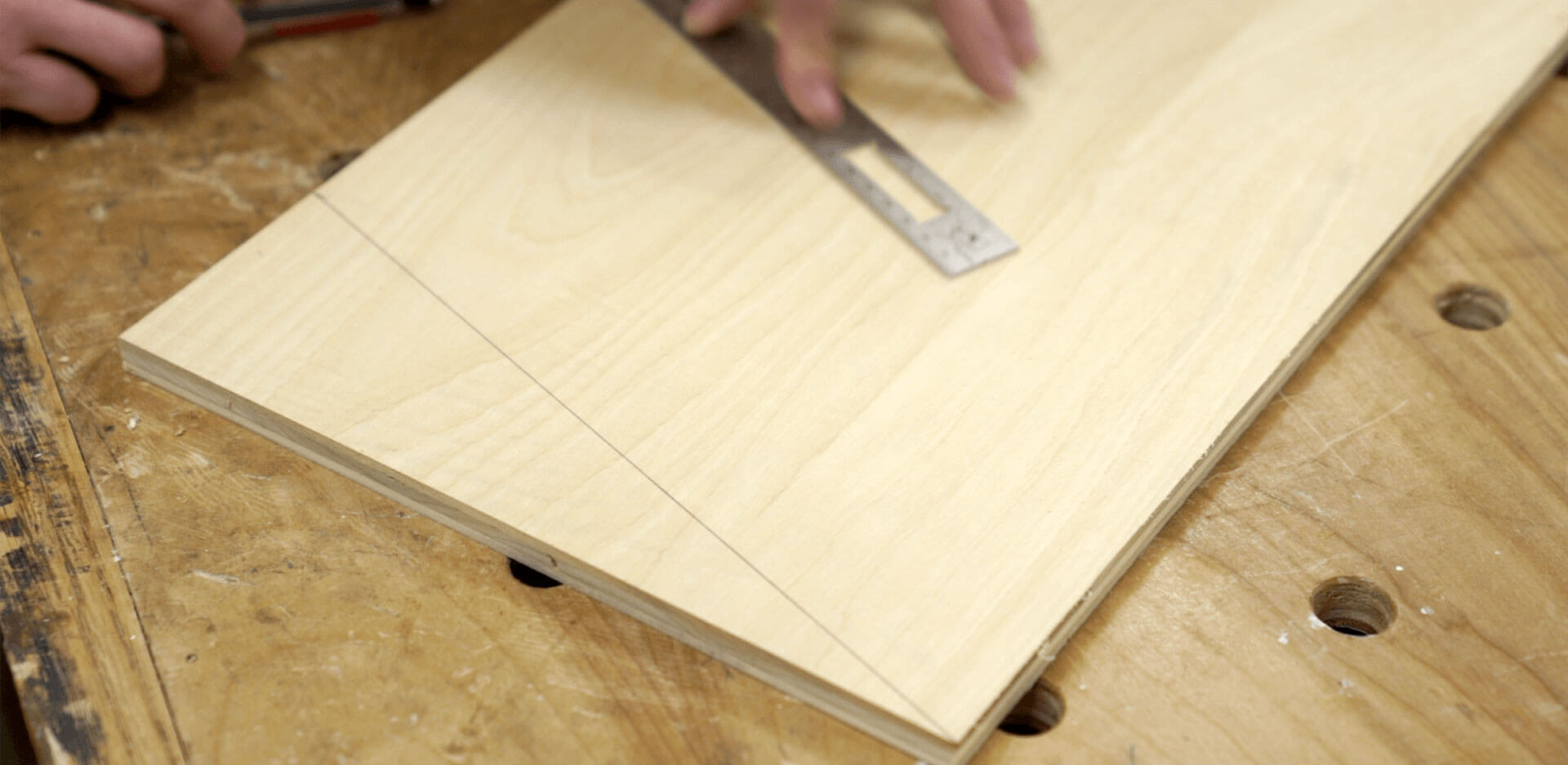 Begin by making the charging platform cleat that will hold the charging platform at an angle. Instead of targeting a specific degree, draw a line from 3” on one edge and 0” on the other. This should result in a line at around 16 to 17 degrees.