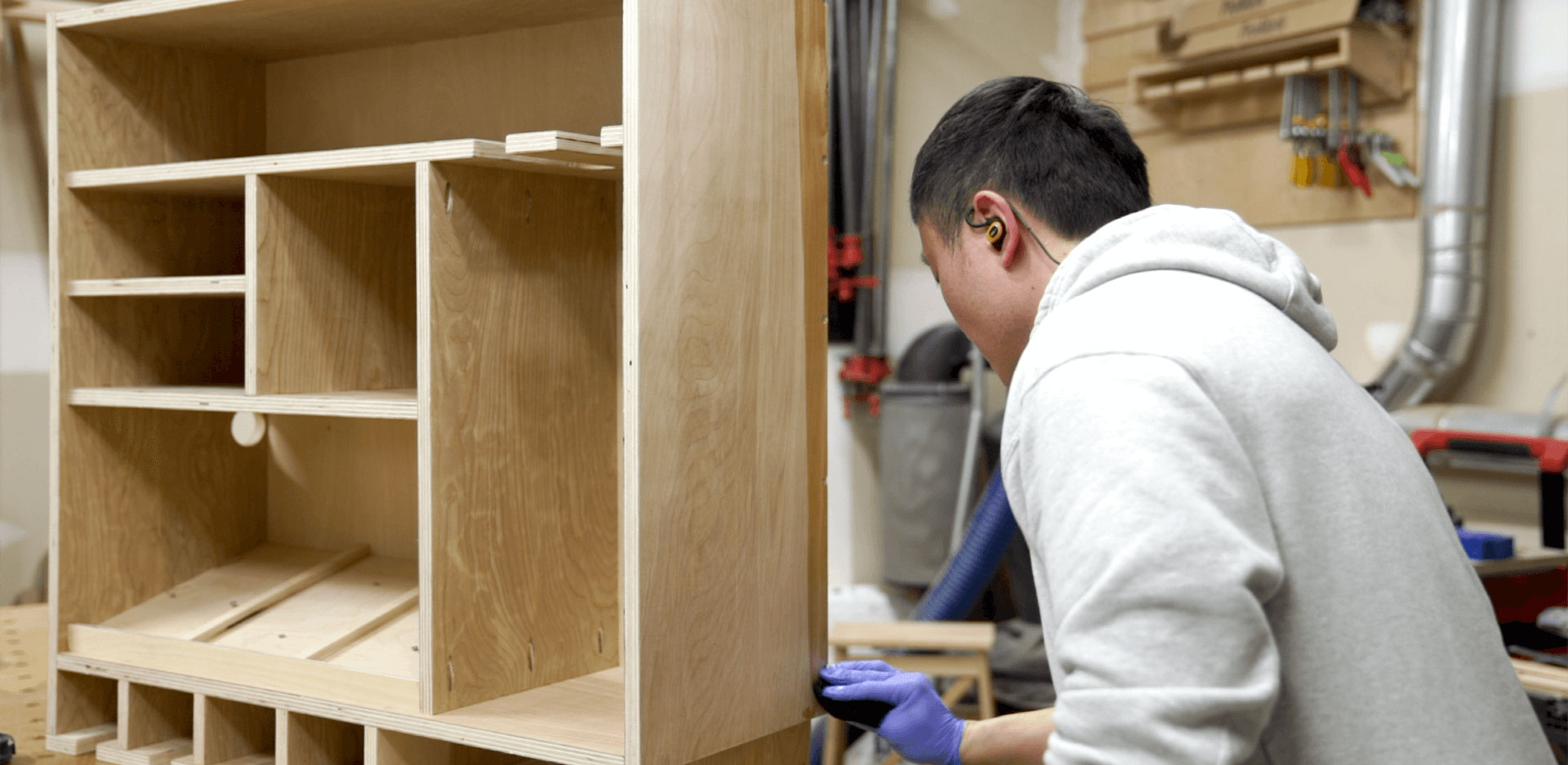 Once the pocket holes have been drilled in the top and bottom panels, sand all four panels starting with 150 grit, to 180 grit, and finishing with 220 grit before assembly. It will be pretty difficult to sand those corners once everything is glued up.