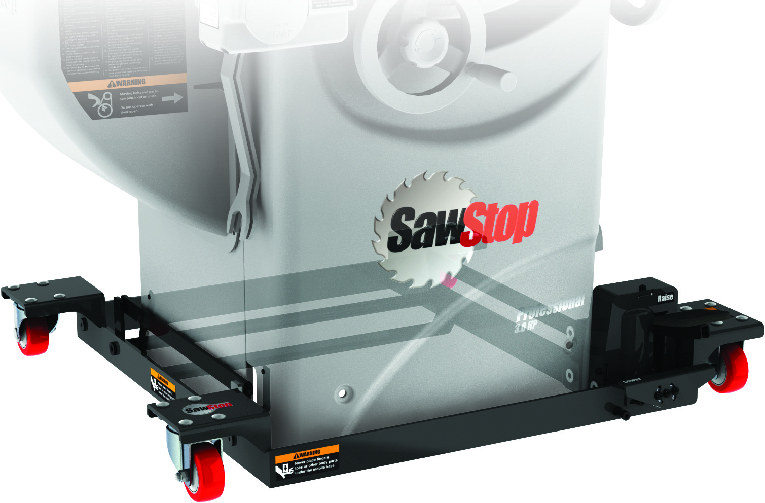 MB-PCS-INDThe easiest, smoothest-moving base available for the Professional Cabinet Saw. With four independent casters, you can quickly and easily move your saw into a corner and out of the way when not in use. No need to worry about wheel brakes: when disengaged the saw rests firmly on the ground, setting the saw’s weight directly on the floor, not the wheels. Maximize compatibility with SawStop Options, from In-Line Router Tables to the Sliding Crosscut Table and more. The 1,000 lb capacity supports the saw and extention table, no additional extention hardware needed. No flimsy wheel brakes to deal with and non-marring polyurethane wheels to keep your floors in tact. Assembly includes kit to adapt Industrial Mobile Base for use with Professional Cabinet Saw.