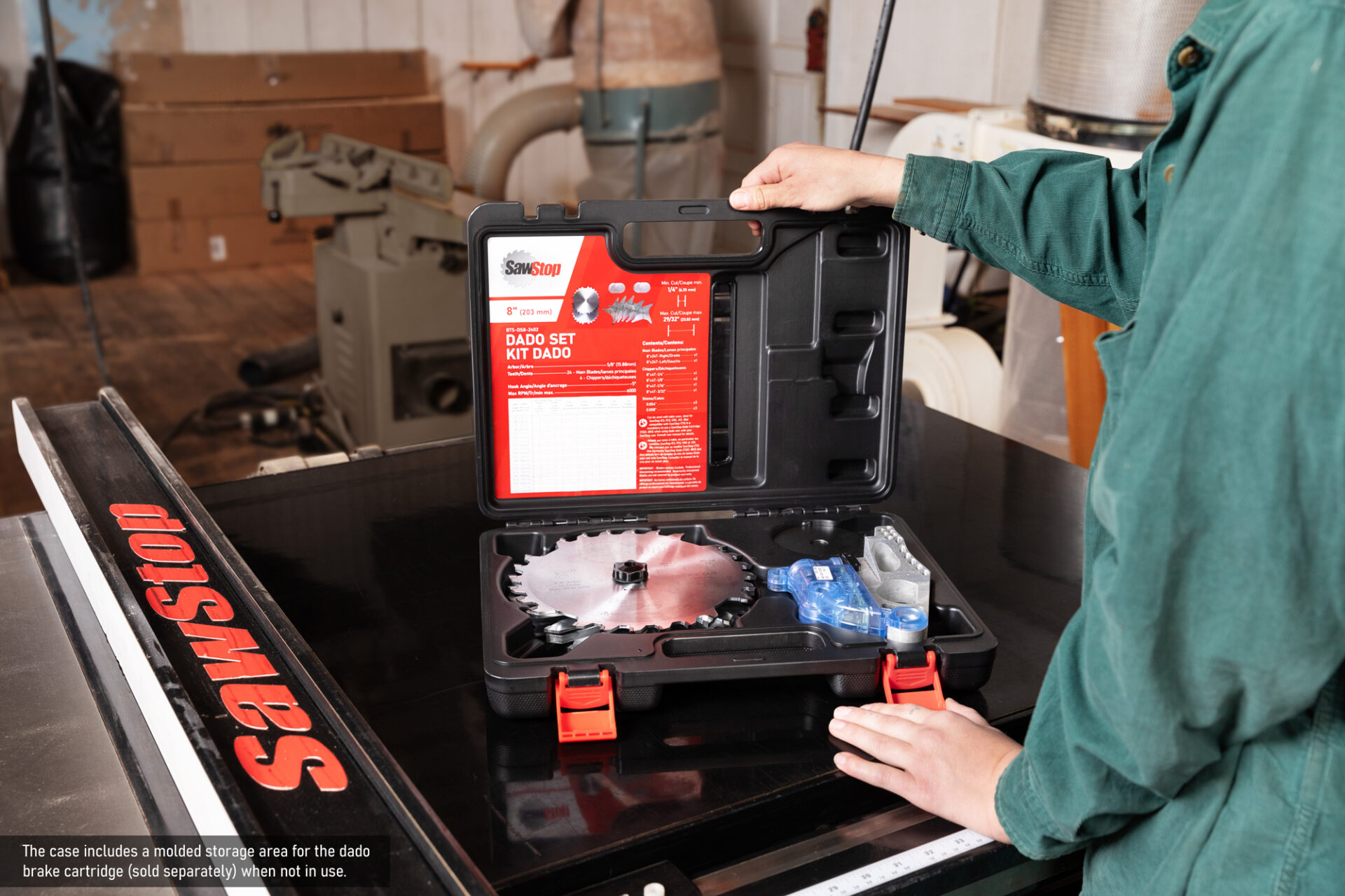 The case includes a molded storage area for the dado brake cartridge (sold separately) when not in use.